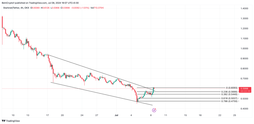 STRK:n neljän tunnin kaaviosta arvioidut hintaliikkeet paljastavat, että altcoinin hinta on murtautunut laskevan kanavansa yläviivan yläpuolelle, joka on muodostanut vastustusta 17. kesäkuuta lähtien.