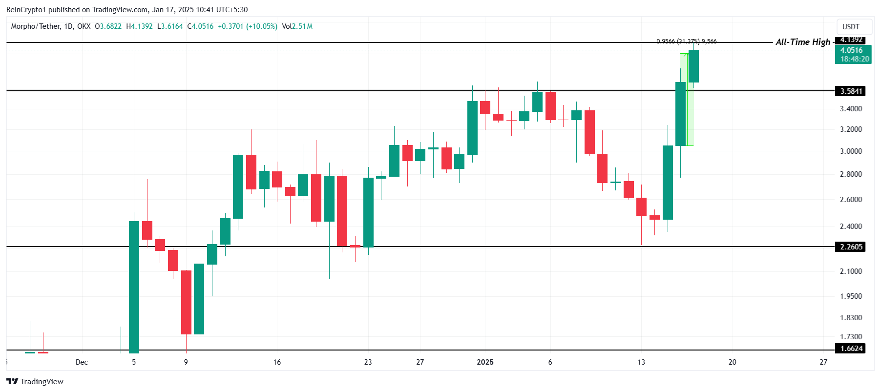 MORPHO:n hinta nousi 31 % viimeisen 24 tunnin aikana, nousten 4,00 dollariin. Vaikuttava hintaralli näki altcoinin saavuttavan uuden kaikkien aikojen korkeimman (ATH) tason 4,13 dollaria, mikä osoittaa vahvaa momentumia markkinoilla ja lisääntynyttä sijoittajien kiinnostusta.