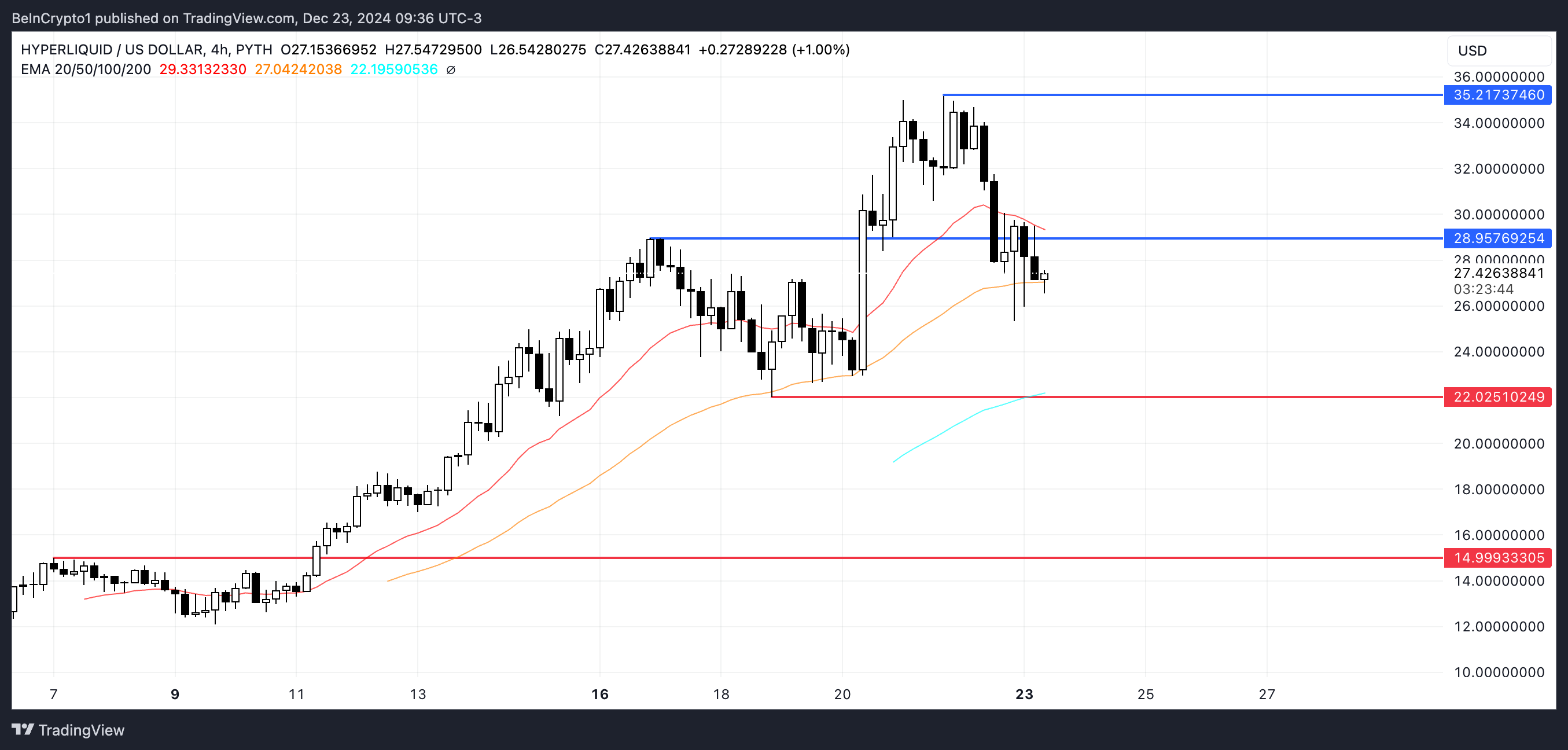 Teknisestä näkökulmasta vastustaso 28,95 dollaria on merkittävä HYPE:n hinnan kehitykselle.