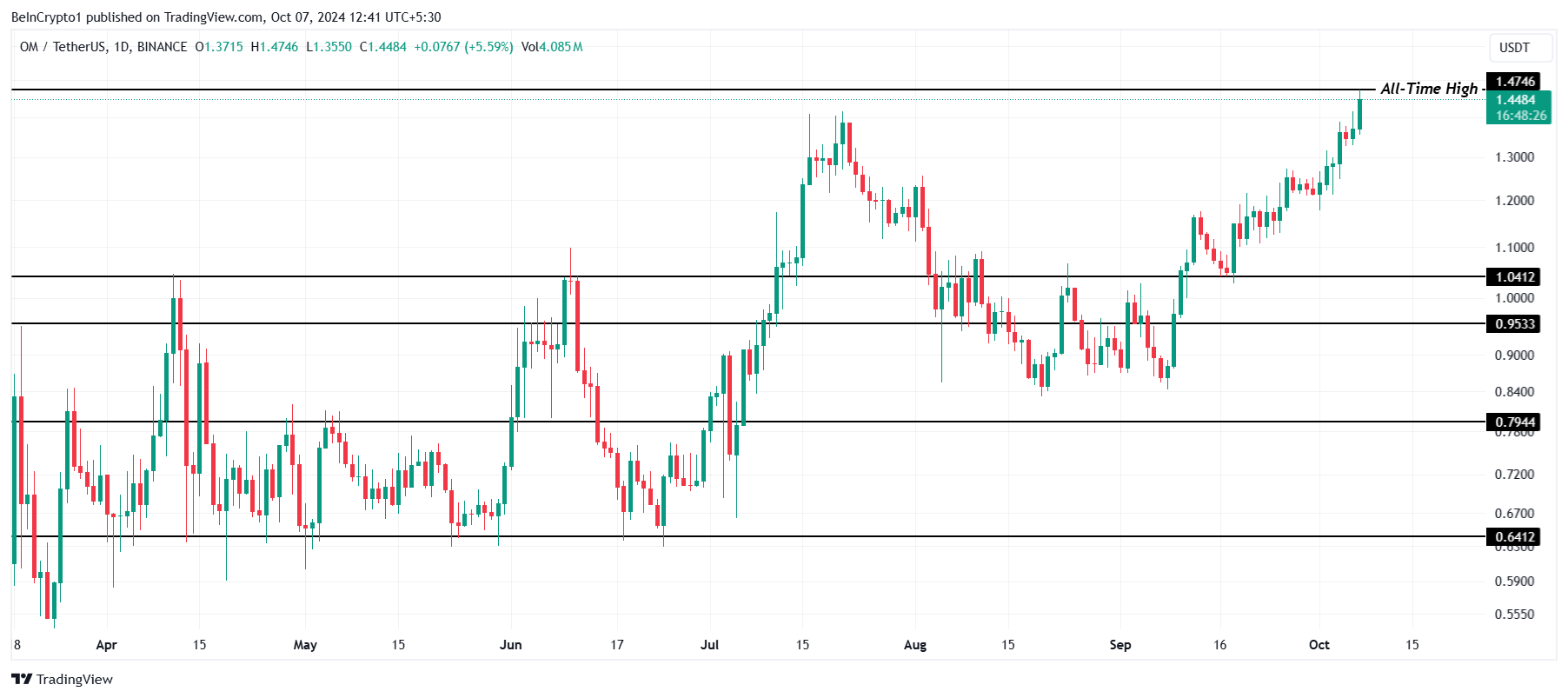 OM:n hinnan edellinen ATH saavutettiin heinäkuun puolivälissä, ja uusi korkein hinta oli 1,47 dollaria. Näyttää kuitenkin siltä, että tämä ATH jää lyhytaikaiseksi, sillä härkämäisyys saattaa jatkaa hinnan nostamista.