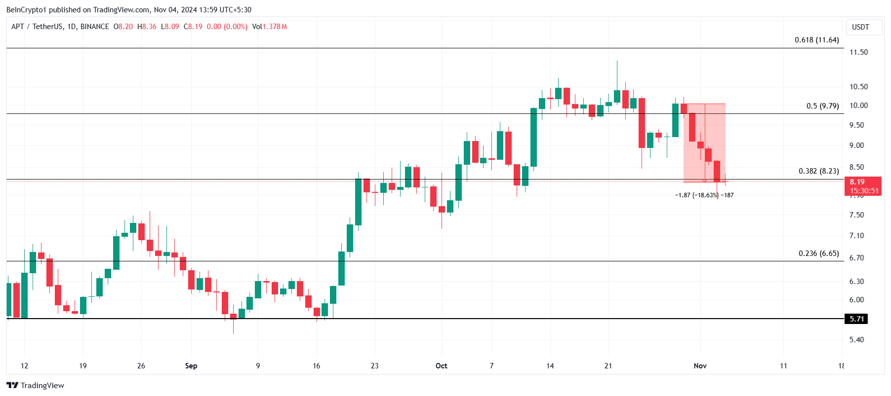 Aptoksen hinta laski 18% viimeisen viiden päivän aikana, heijastaen laajempaa markkinoiden heikkoutta. APT yrittää tällä hetkellä pysyä yläpuolella 38,2%:n Fibonacci-vetäytymislinjasta, joka on 8,23 dollaria, ja on kriittinen tukitaso, joka voisi vakauttaa sen viimeaikaisen laskusuuntauksen.