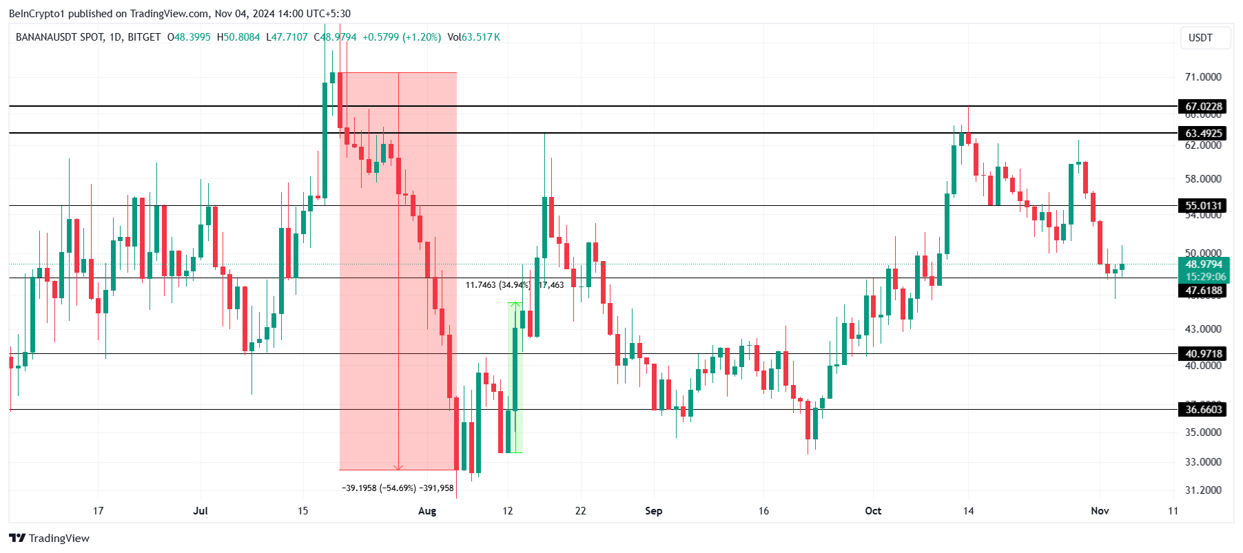 BANANA melkein toipui heinäkuun tappioistaan 54%:n romahduksen jälkeen, mutta ei onnistunut rikkomaan 63,49 dollarin vastustustasoa. Tämä vastus pysäytti sen toipumisen, ja altcoin on sen jälkeen laskenut, käyden nyt kauppaa 48,97 dollarissa, kun karhumainen paine kasvaa.
