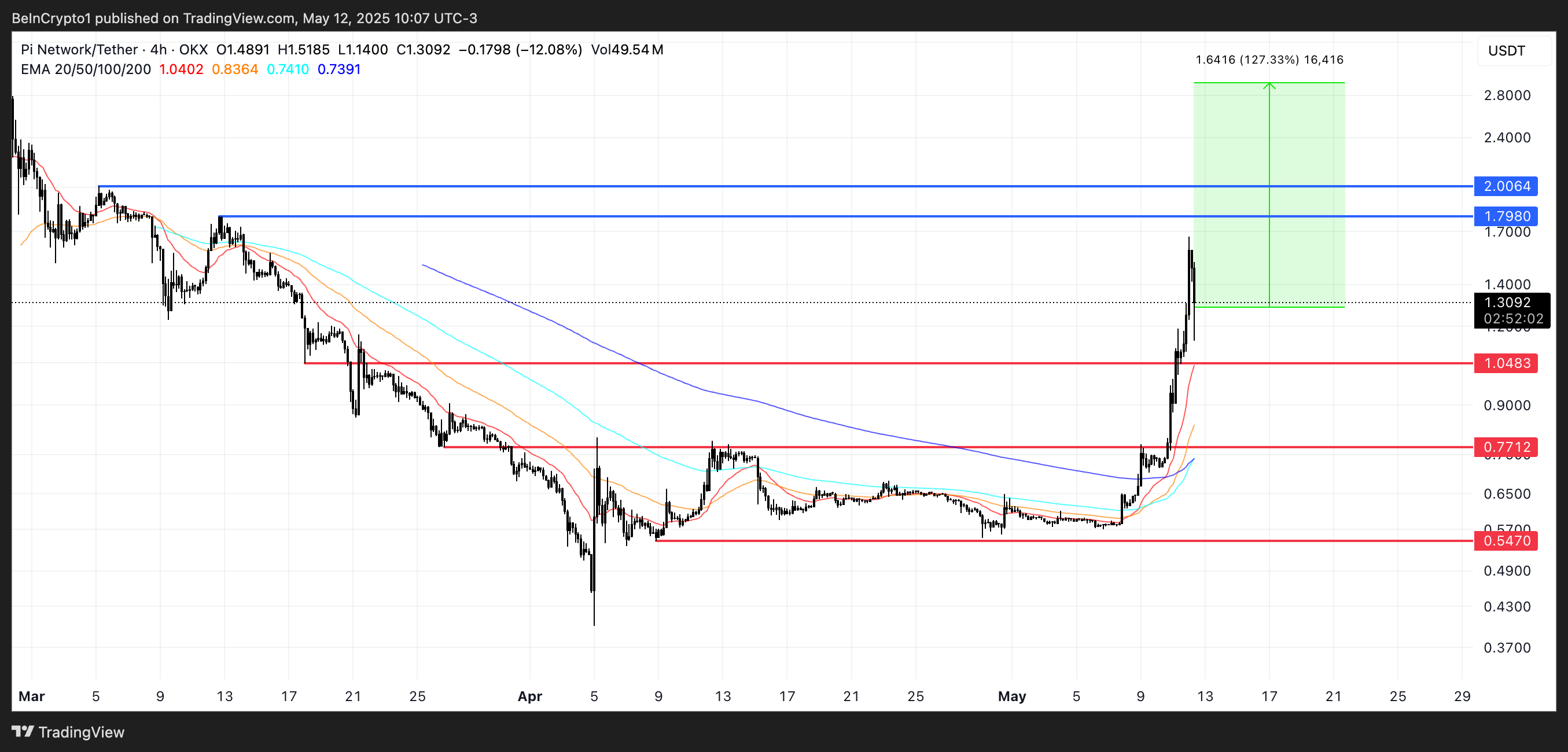 Tämä suuntaus on nyt kääntynyt jyrkästi—PI:n hinta on noussut yli 121 % viimeisen seitsemän päivän aikana ja juuri nousi takaisin yli 1 dollarin ensimmäistä kertaa maaliskuun lopun jälkeen, osoittaen vahvoja merkkejä uudesta suuntauksesta.