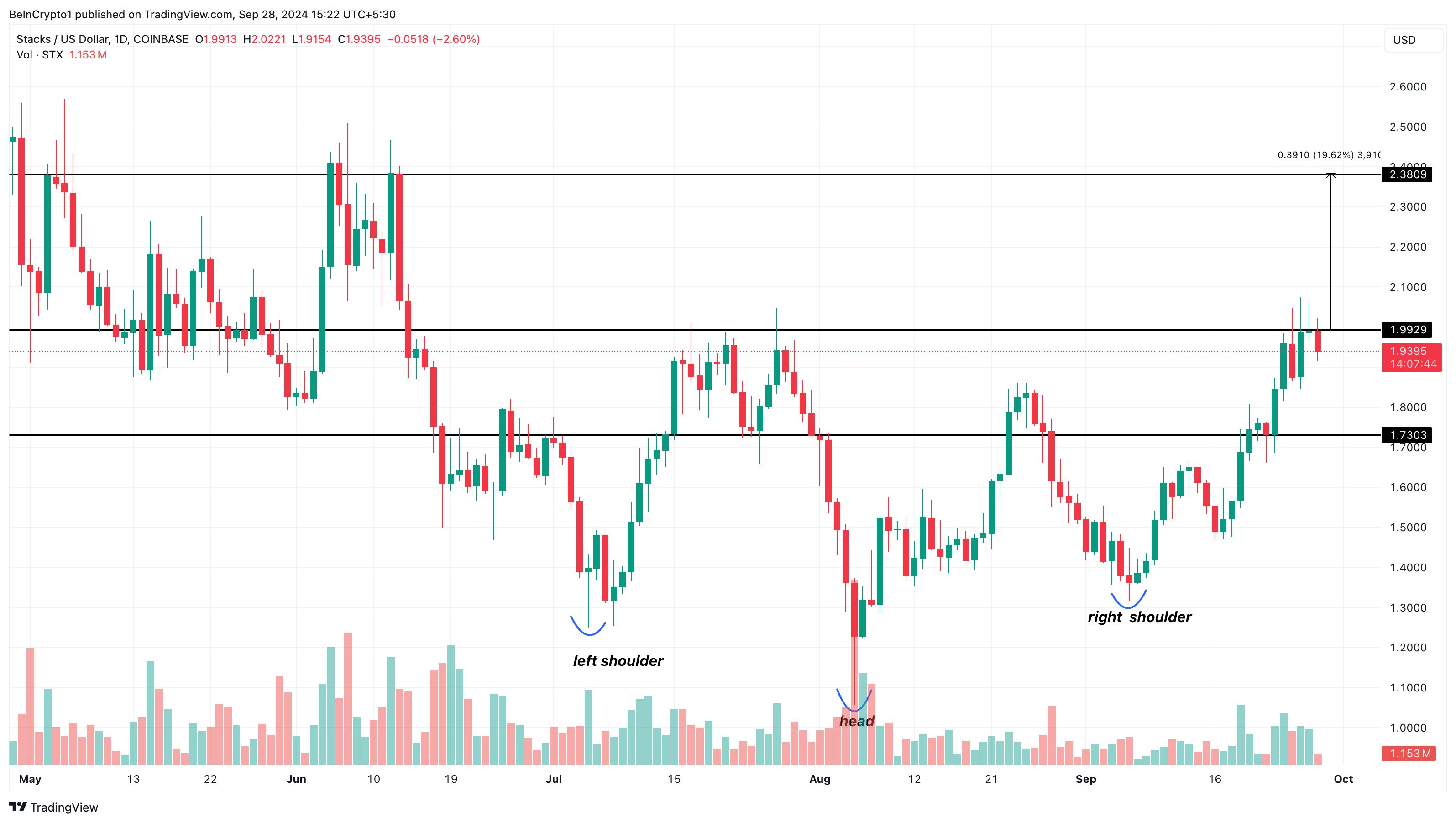 Tällä hetkellä STX:n hinta on 1,964 dollaria. Päivittäisessä kaaviossa altcoinin hinta laski 1,05 dollariin 5. elokuuta tapahtuneen syöksyn aikana. Kuitenkin, käänteisen pään ja hartiat -kuvioiden muodostuminen näyttää muuttaneen tilannetta tokenille.