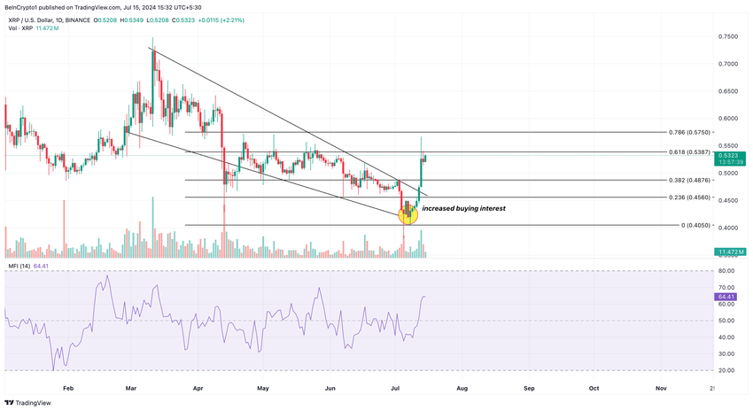 Aluksi XRP kohtasi usean kuukauden laskevan kanavan, jossa alaspäin suuntautuvat trendiviivat yhdistivät alemmat ylä- ja alamäet. Analyysi osoittaa kuitenkin, että altcoin räjähti ostokoron voimistumisen jälkeen 0,42 dollariin. Tämä johti myöhemmin tokenin nousuun 0,53 dollariin.