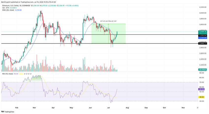 Lehdistöhetkellä ETH:n arvo on 3 360 dollaria. Hinta käy kauppaa myös 20 päivän EMA:n (sininen) yläpuolella. EMA on lyhenne sanoista Exponential Moving Average, ja se mittaa hintasuunnan muutoksia tietyn ajanjakson aikana.