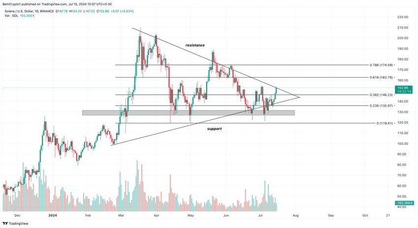Nykyinen SOL/USD-päiväkaavio osoittaa, että altcoin on muodostanut symmetrisen kolmion. Tälle kaaviokuviolle on ominaista lähentyvät trendiviivat, jotka yhdistävät sarjan alempia ylä- ja alamäkiä.