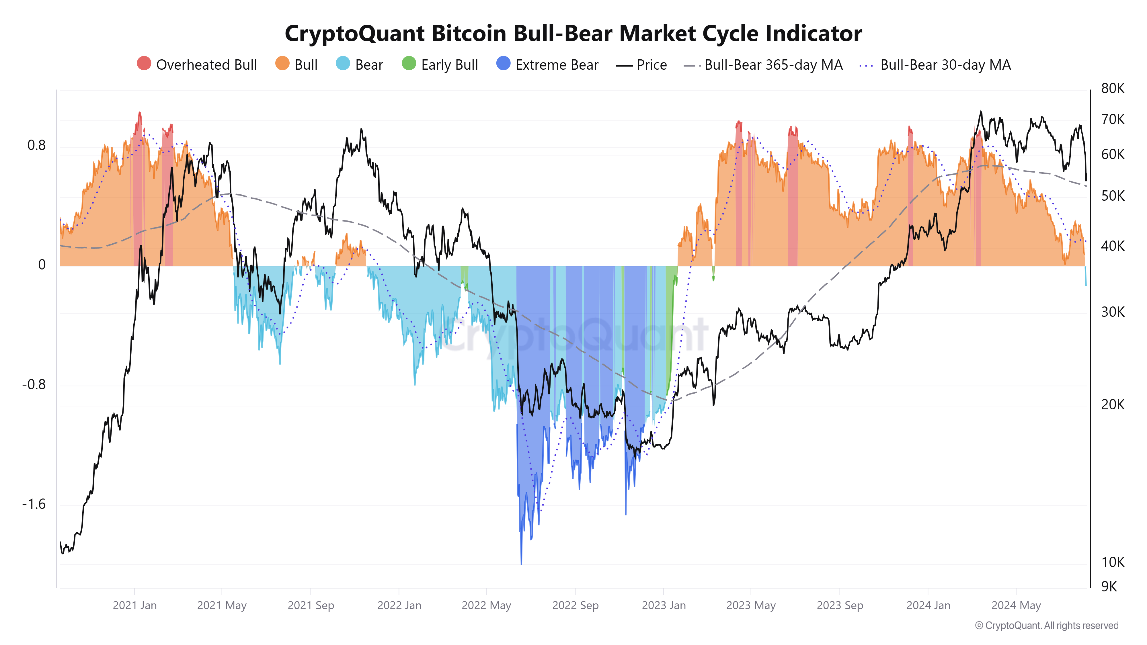 Toinen tärkeä signaali on Bitcoinin härkä- ja karhumarkkinasyklin indikaattori, joka ei viesti selvästi pohjasta. Kuten nimestä voi päätellä, indikaattoria käytetään markkinan vauhdin arvioimiseen.
