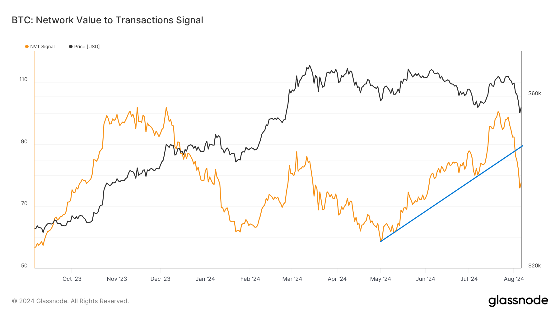 Verkon arvon ja transaktioiden (NVT) signaalia käytetään arvioimaan suhdetta kryptovaluutan markkina-arvon ja sen verkon transaktiomäärän välillä. Poiketen hieman NVT-suhteesta, tämä indikaattori mittaa markkina-arvoa suhteessa 90 päivän liukuvan keskiarvon päivittäiseen transaktiovolyymiin.