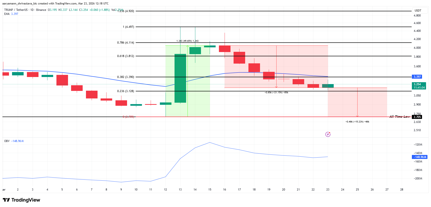 Official Trump (TRUMP) käy kauppaa 3,254 dollarissa, ja hinta on noussut 1,88 %. Kuitenkin On-Balance Volume saavutti huipun noin 13.–14. maaliskuuta ja on sen jälkeen laskenut noin -120 miljoonasta dollaria -148,96 miljoonaan dollariin. OBV:n lasku samaan aikaan, kun meemikolikon hinta palautui hetkellisesti, on jakelutyypillinen volyymimerkki, ei kertymää.