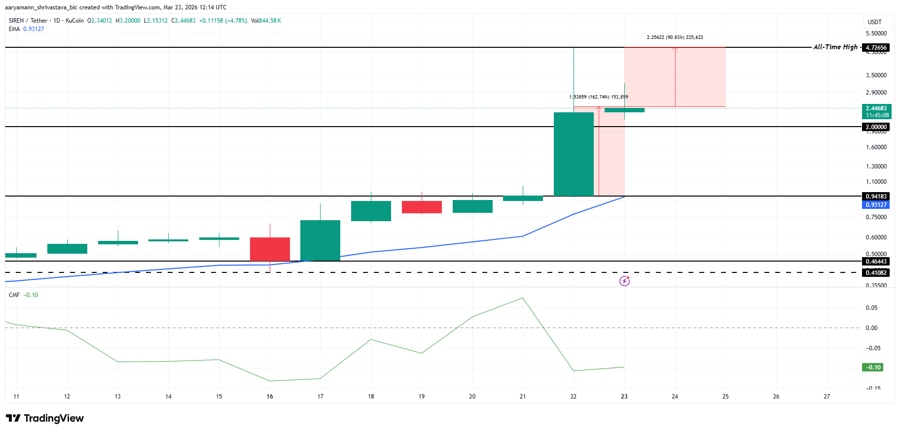 Siren (SIREN) käy tällä hetkellä kauppaa 2,44 dollarin hinnalla – nousua on kertynyt 163 % maaliskuun 21. päivän pohjasta vain kahdessa päivässä. Kaikkien aikojen korkein, 4,72 dollaria, on noin 90 % nykyhinnan yläpuolella. Kaavioon on merkitty projektoitu liike juuri tälle tasolle.