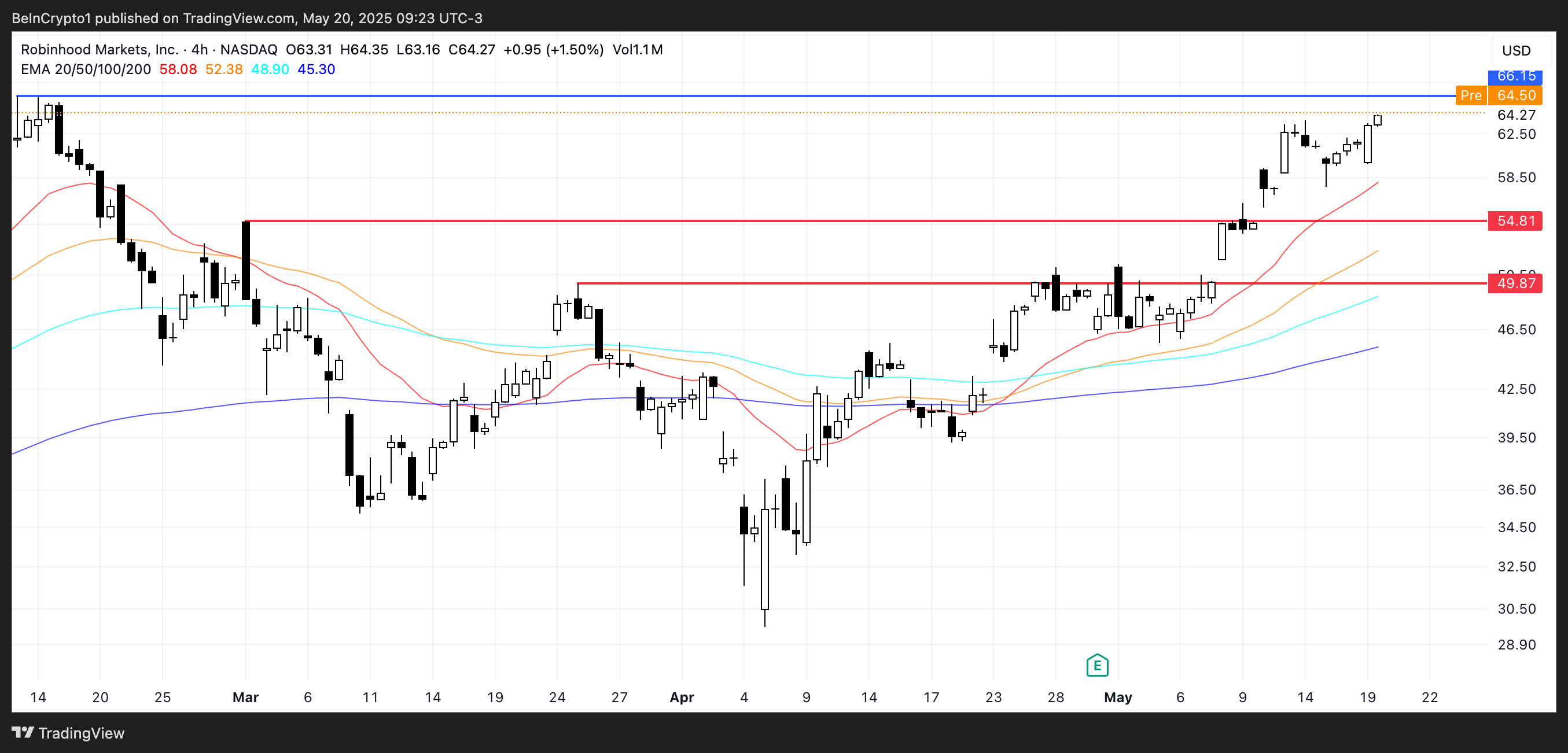 Seuraava keskeinen vastustaso on 66,15 dollaria; selkeä läpimurto sen yläpuolella voisi viedä HOOD:n kartoittamattomalle alueelle, ylittäen 70 dollarin rajan ensimmäistä kertaa ja asettaen uusia kaikkien aikojen ennätyksiä.