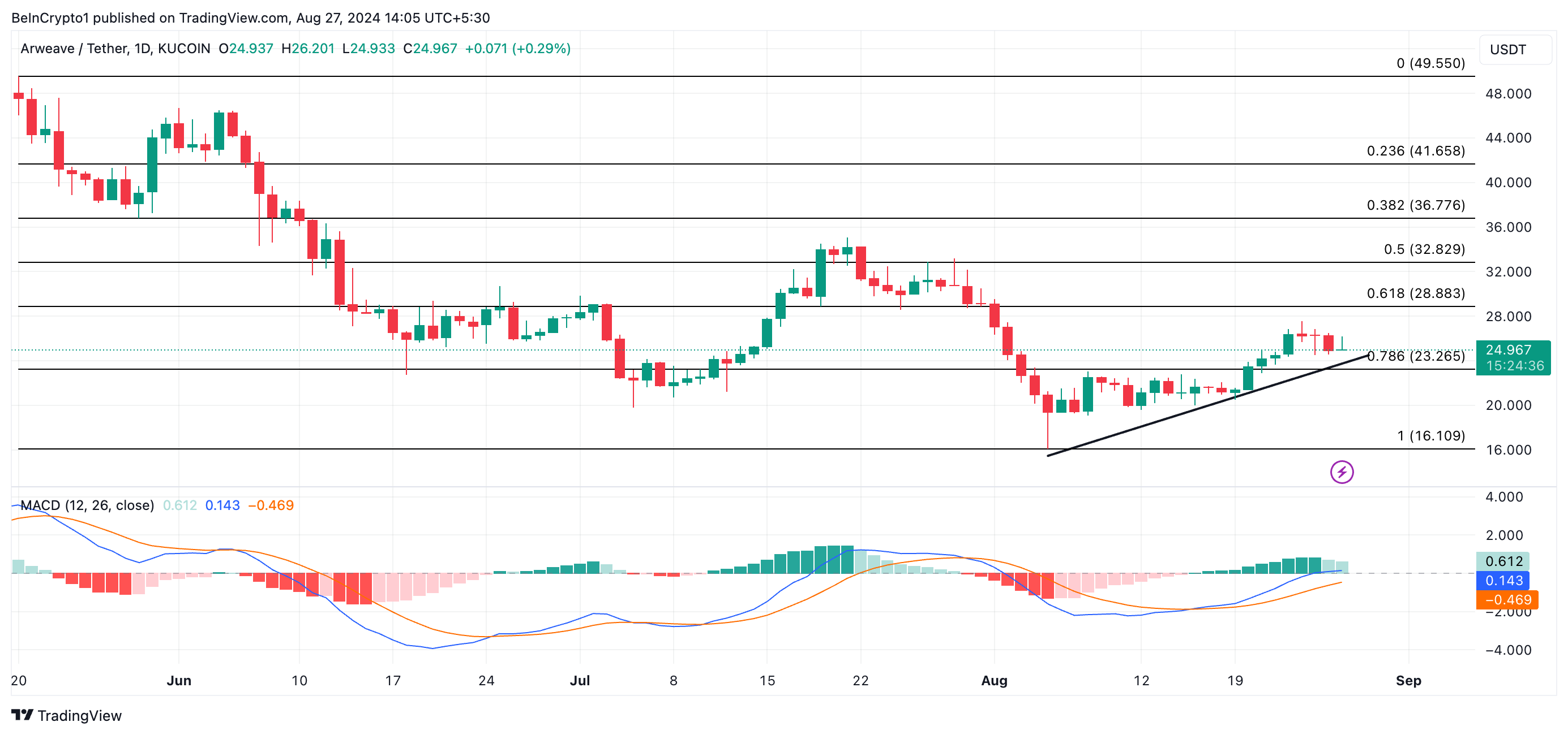Arweave, hajautettu tallennusverkko, on nähnyt AR-tokeninsa palautuvan kuuden kuukauden alhaisimmasta arvosta 16,10 dollaria elokuun 5. päivänä. Hinta on sen jälkeen noussut, seuraten nousevaa trendiviivaa, joka osoittaa AR:n kertymisen lisääntymistä viime viikkoina. Tällä hetkellä kaupankäynnin hinta on 25,22 dollaria, ja AR:n hinta on noussut 56%.