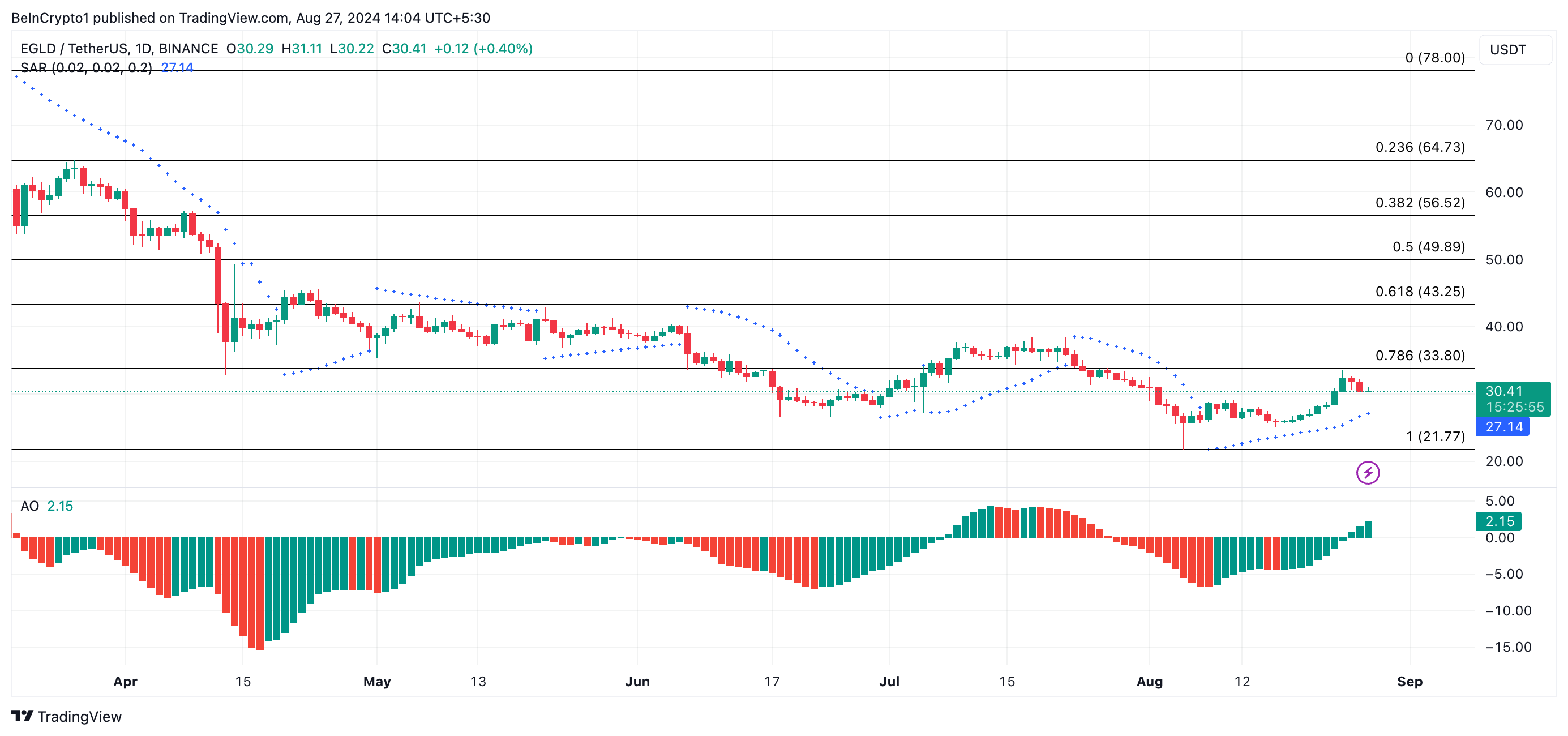 Jos nykyinen nousutrendi jatkuu, EGLD:n hinta voi nousta 33,80 dollariin, mikä on 10% korkeampi kuin sen nykyinen arvo 30,75 dollaria. kuitenkin, jos markkinatunnelma muuttuu härkämarkkinasta karhumarkkinaksi, EGLD:n hinta voi laskea 21,77 dollariin, mikä on sen alin taso elokuun 5. päivän markkinoiden laskun jälkeen.