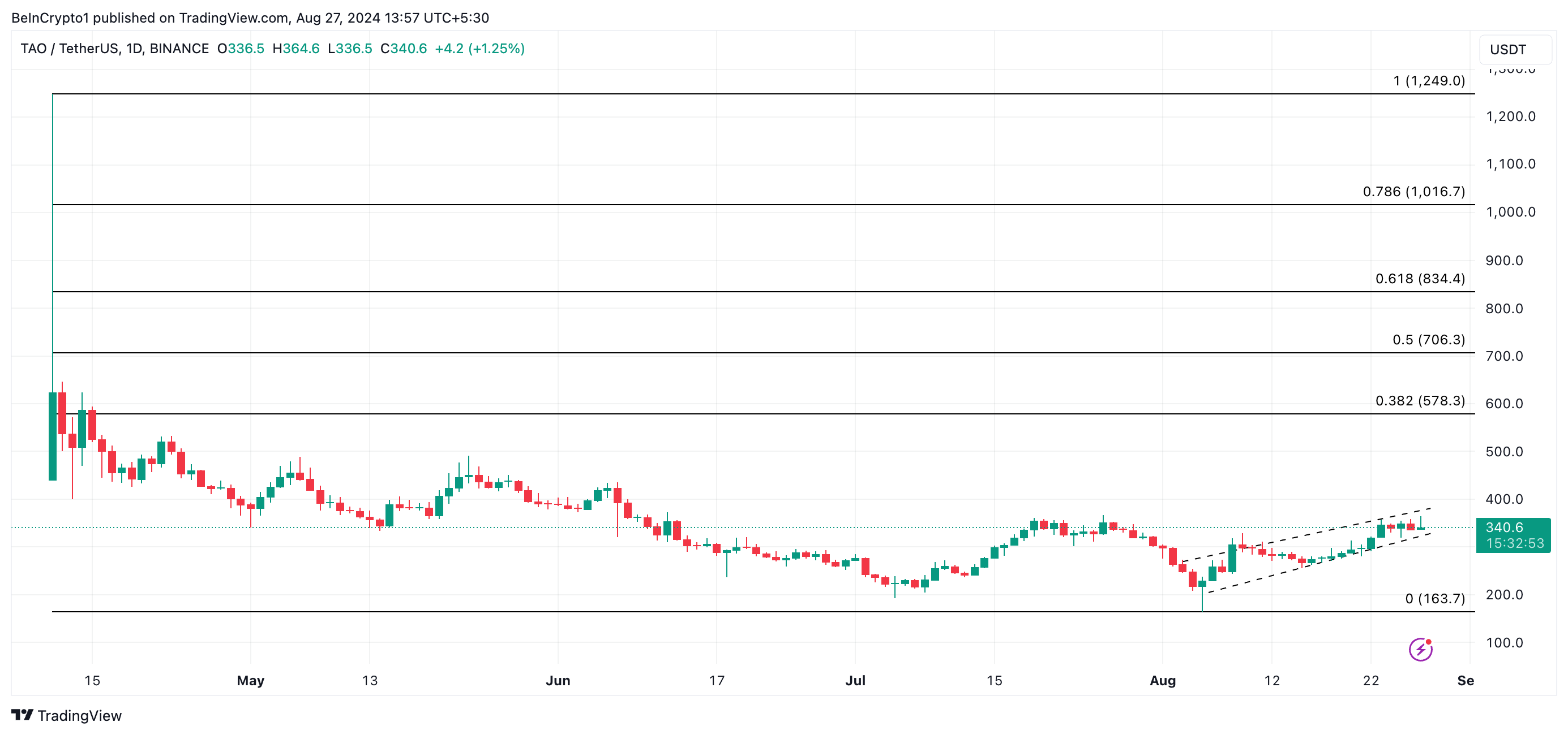 TAO, altcoin, joka toimii Bittensorin hajautetun koneoppimisverkon voimanlähteenä, on nähnyt hinnan nousun yli 15% viime viikolla. Kuun alusta lähtien altcoin on käynyt kauppaa nousevassa kanavassa.