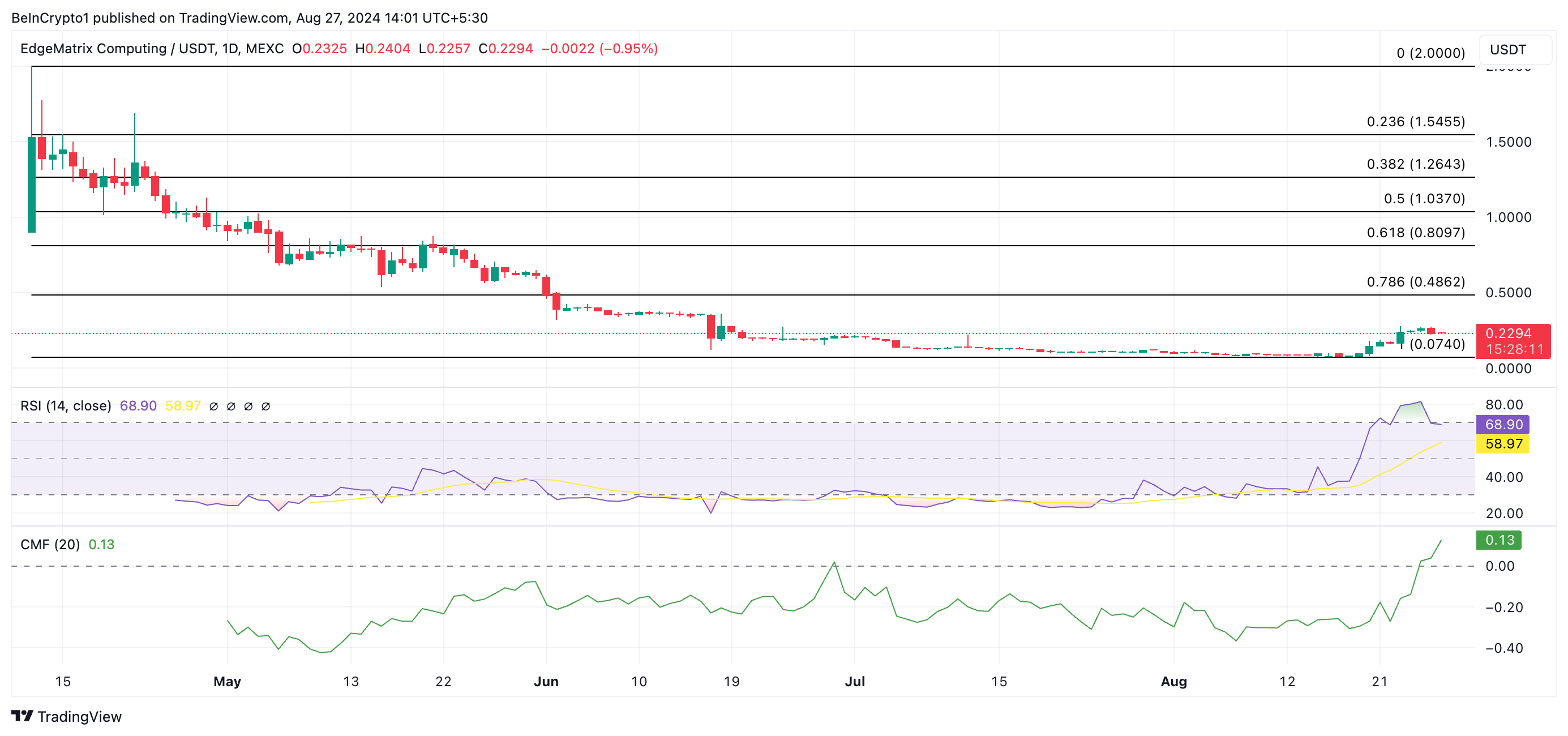 Lisäksi EMC:n suhteellinen vahvuusindeksi (RSI) on 68,90:ssä, mikä viittaa siihen, että ostovoima on vahvaa ja ylittää markkinaosapuolten myyntitoimet.