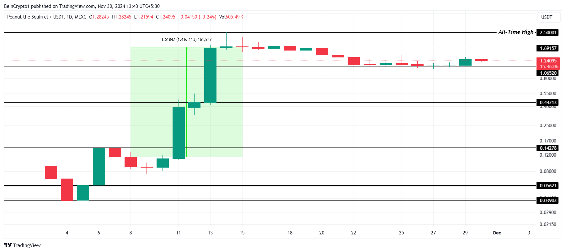 PNUT on noussut yhdeksi parhaiten menestyvistä kryptovaluuttaomaisuusvaroista tässä kuussa, nousten vaikuttavat 1 416% vain viikossa. Meemikolikko saavutti kaikkien aikojen korkeimman arvon (ATH) 2,50 dollaria, herättäen merkittävää sijoittajien huomiota. Tämä nopea hinnannousu korostaa meemikolikoiden epävakaata mutta korkean tuoton potentiaalia.