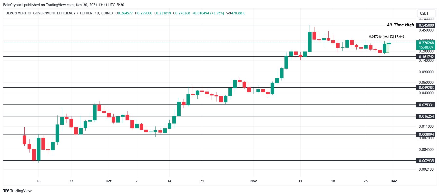 DOGE(GOV) saavutti kaikkien aikojen korkeimman arvon (ATH) 0,545 dollaria marraskuussa, mikä johtui lisääntyneestä kiinnostuksesta Yhdysvaltain presidentinvaaleihin. Poliittisten olosuhteiden ympärillä oleva hype ja avainhenkilöiden osallistuminen ovat luoneet vahvan nousun meemikolikolle. Jotkut analyytikot kuitenkin ehdottavat, että tämä ATH ei välttämättä ole vielä huipussaan.