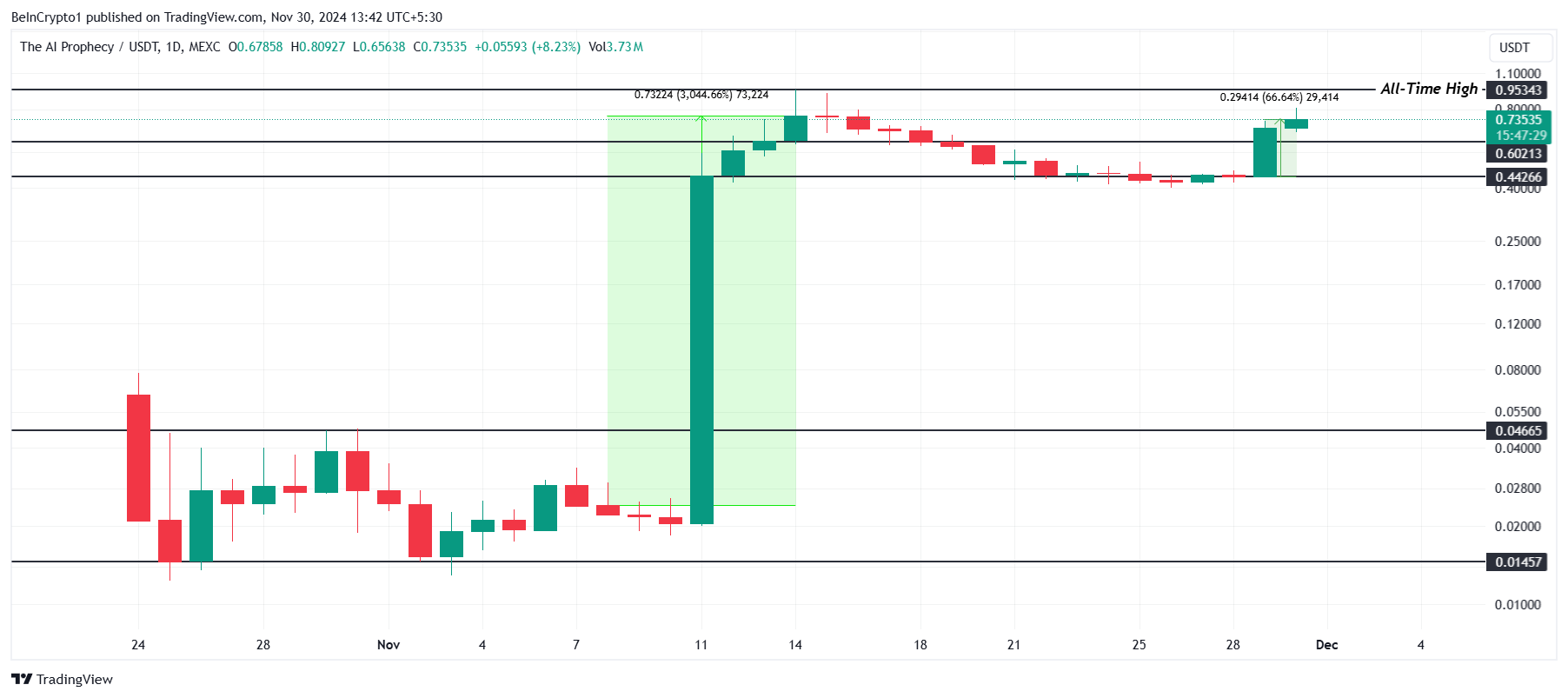 PEPE koki odottamattoman nousun marraskuussa, nousten lähes 84 % vain 48 tunnissa. Tämä nopea nousu auttoi meemikolikkoa saavuttamaan kaikkien aikojen korkeimman arvon (ATH) 0,00002597 dollaria, yllättäen sijoittajat ja herättäen uudelleen kiinnostusta kolikkoon. Sen suorituskyky korostaa meemikolikoiden vaihtelevaa luonnetta kryptomarkkinoilla.