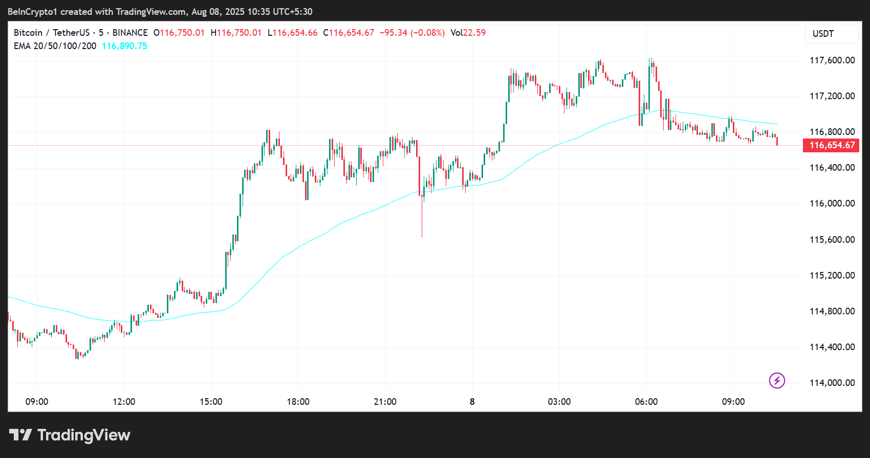 Lisäksi BTC:n 5 minuutin EMA100 on keskeinen tekninen taistelukenttä, ja analyytikot korostavat sitä sekä vastuksena että tukena viimeaikaisissa istunnoissa. Kun Bitcoinin hinta on nyt tämän liukuvan keskiarvon alapuolella, se yleensä viittaa lyhyen aikavälin karhumarkkinaan.