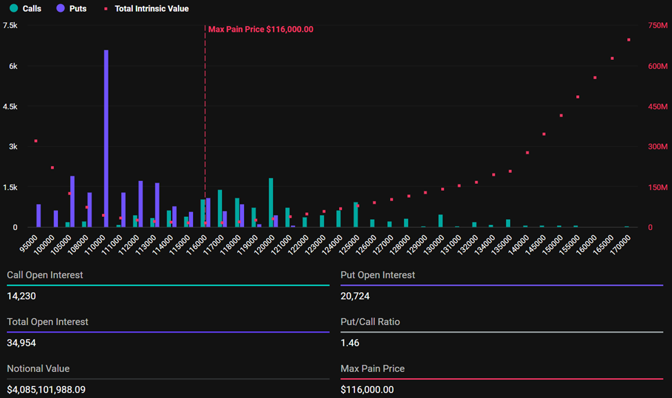 Deribitin tietojen mukaan Bitcoin johtaa optiosopimuksilla, joiden arvo on 4,09 miljardia dollaria ja jotka erääntyvät. Max pain -piste, joka edustaa tasoa, jolla eniten optioita erääntyy arvottomina ja välittäjät kokevat vähiten tappiota, on 116 000 dollaria.