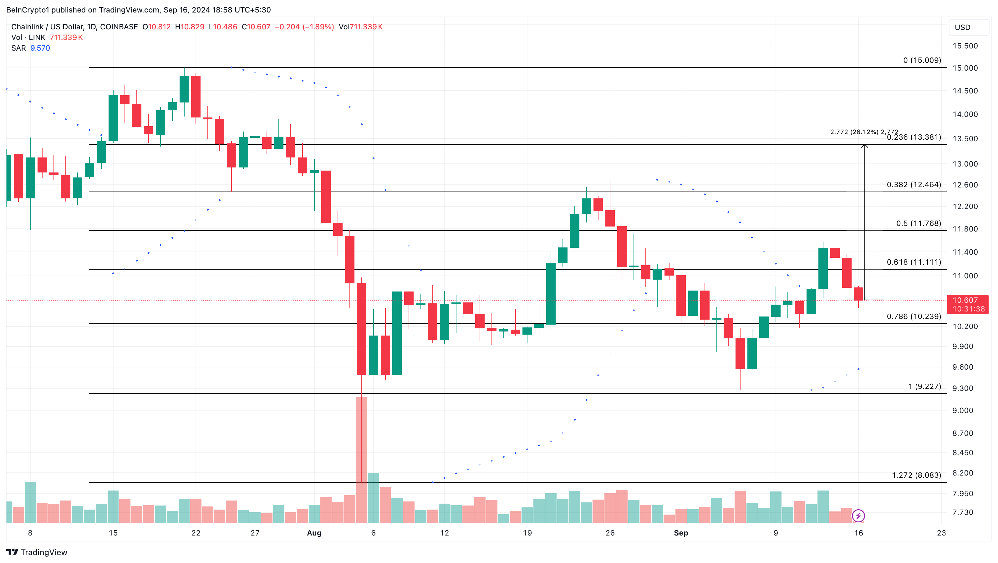 Tällä hetkellä Parabolic SAR on Chainlinkin hinnan alla. Tämän seurauksena kolikon hinta saattaa nousta 26% 13,38 dollariin.