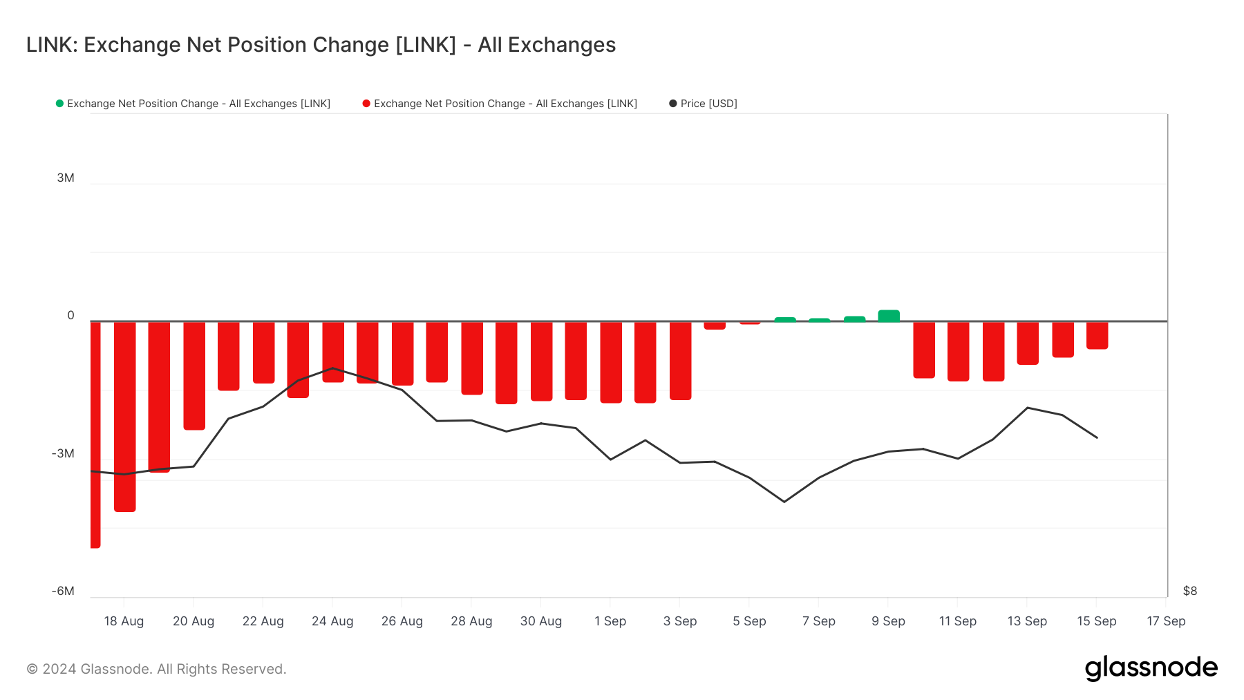 Glassnoden mukaan Chainlink koki lyhyen piikin kolikoiden lähettämisessä pörsseihin 5. ja 9. syyskuuta välisenä aikana, yhtä aikaa hinnan laskun kanssa lähes 11 dollarista 9,20 dollariin.