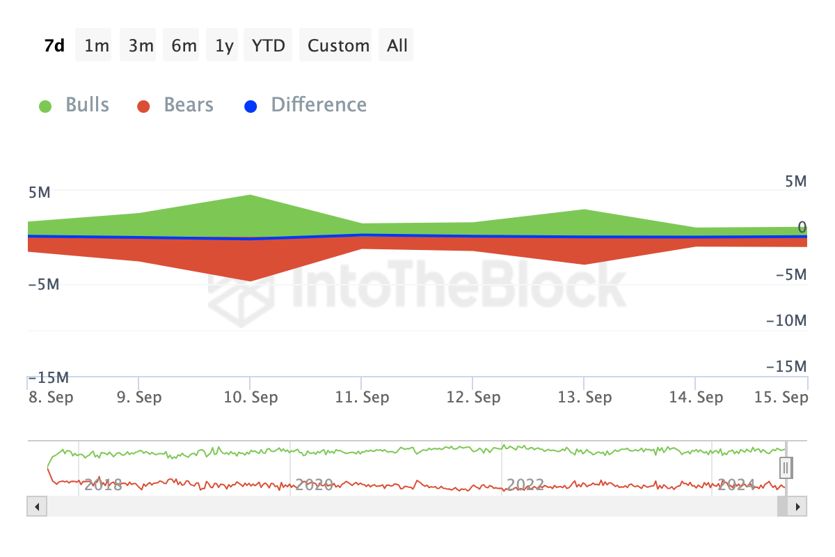 Krypto-härät ovat osoitteita, jotka ostivat vähintään 1% volyymista, kun taas karhut myivät vastaavan määrän. IntoTheBlockin tiedon mukaan Chainlink-härät ovat ostaneet enemmän volyymia kuin karhut ovat myyneet.