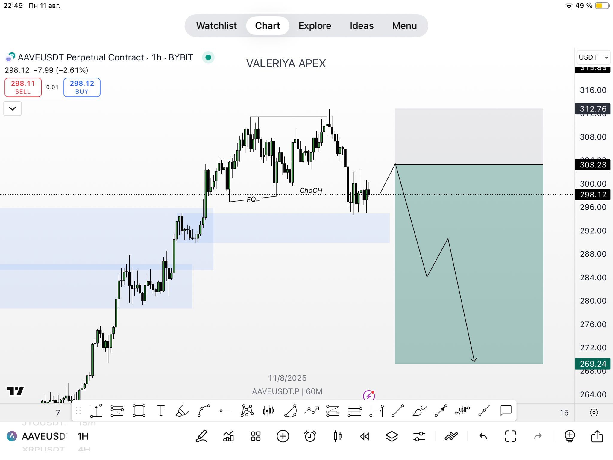 ValeriyBreakoutin mukaan markkinarakenne murtui vaakasuoran pohjan muodostumisen jälkeen, ja siihen liittyi Change of Character (CHoCH) -signaali. Odotettu hinta saattaa palautua hieman ennen laskua kohti 269–272 dollarin tavoitealuetta. Tämä viittaa siihen, että sijoittajien tulisi olla varovaisia lyhyellä aikavälillä, erityisesti niiden, jotka käyvät kauppaa vivulla.