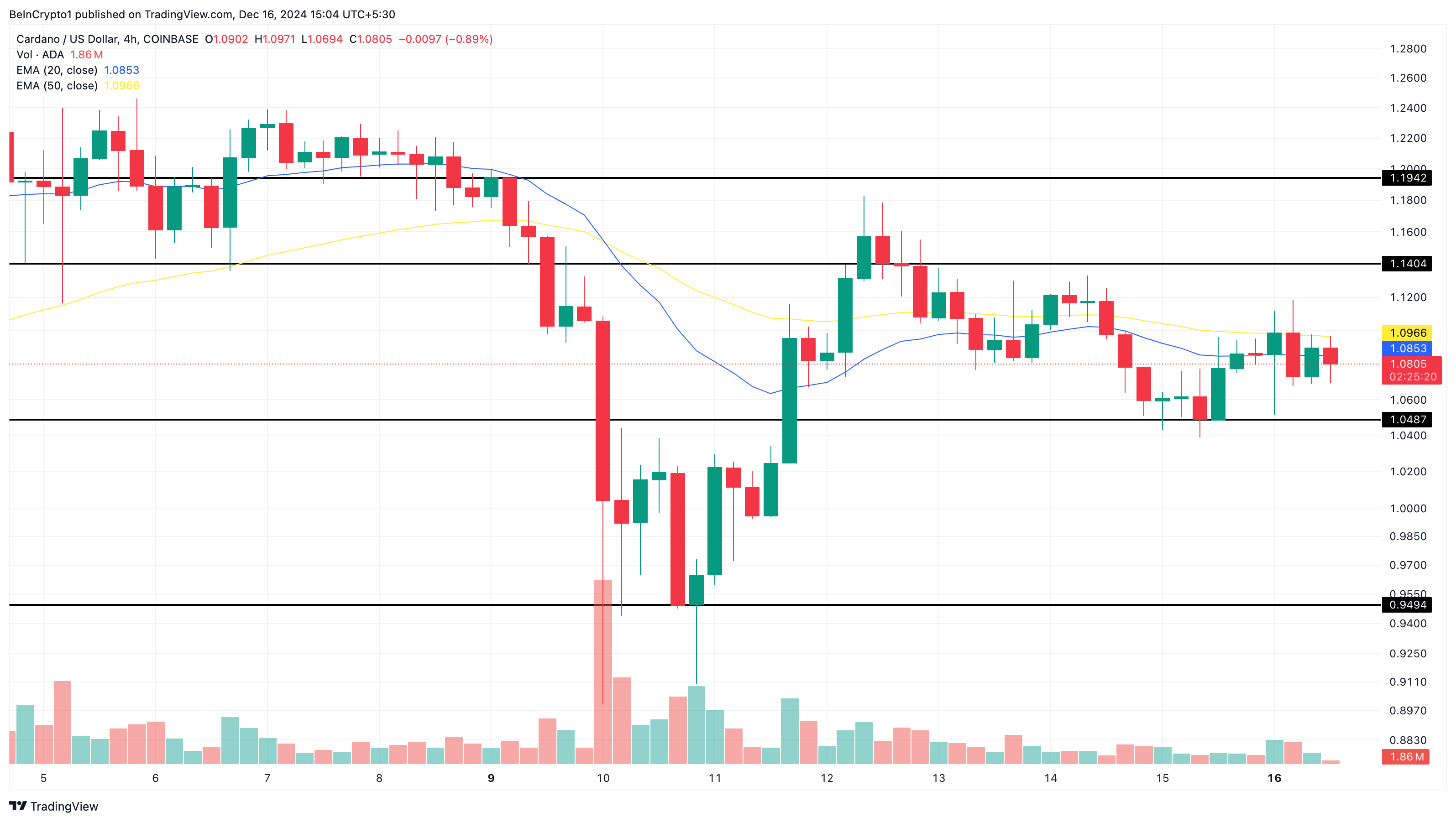 4-tunnin kaavion perusteella ADA:n hinta on pudonnut alle 20 ja 50 Eksponentiaalisen Liukuvan Keskiarvon (EMA). EMA seuraa kryptovaluutan hinnan muutoksia mitatakseen trendiä.