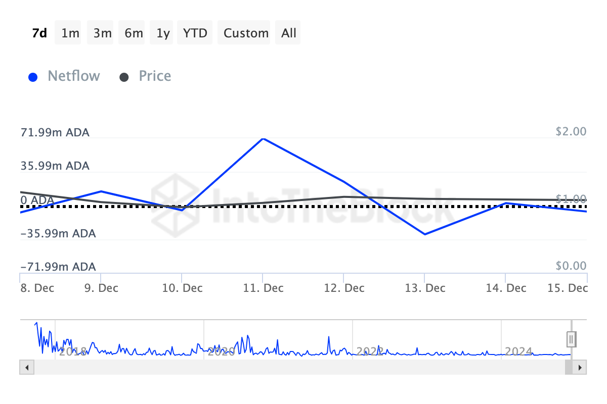 Kun nettovirta kasvaa, se tarkoittaa, että nämä osoitteet ostivat enemmän tokeneita kuin myivät. Toisaalta nettovirran lasku osoittaa jakelun kasvua kertymisen sijaan. IntoTheBlockin mukaan Cardanon suurten haltijoiden nettovirta on laskenut 142 % viimeisen seitsemän päivän aikana.