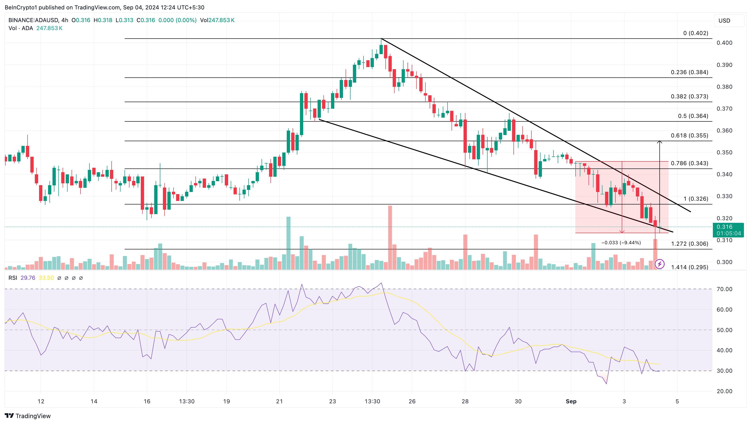 Tällä hetkellä ADA käy kauppaa 0,31 dollarilla, laskien lähes 10 % maanantain päivityksestä lähtien. Kuitenkin päivittäinen kaavio näyttää härkämäisen teknisen kuvion — laskevan kiilan.