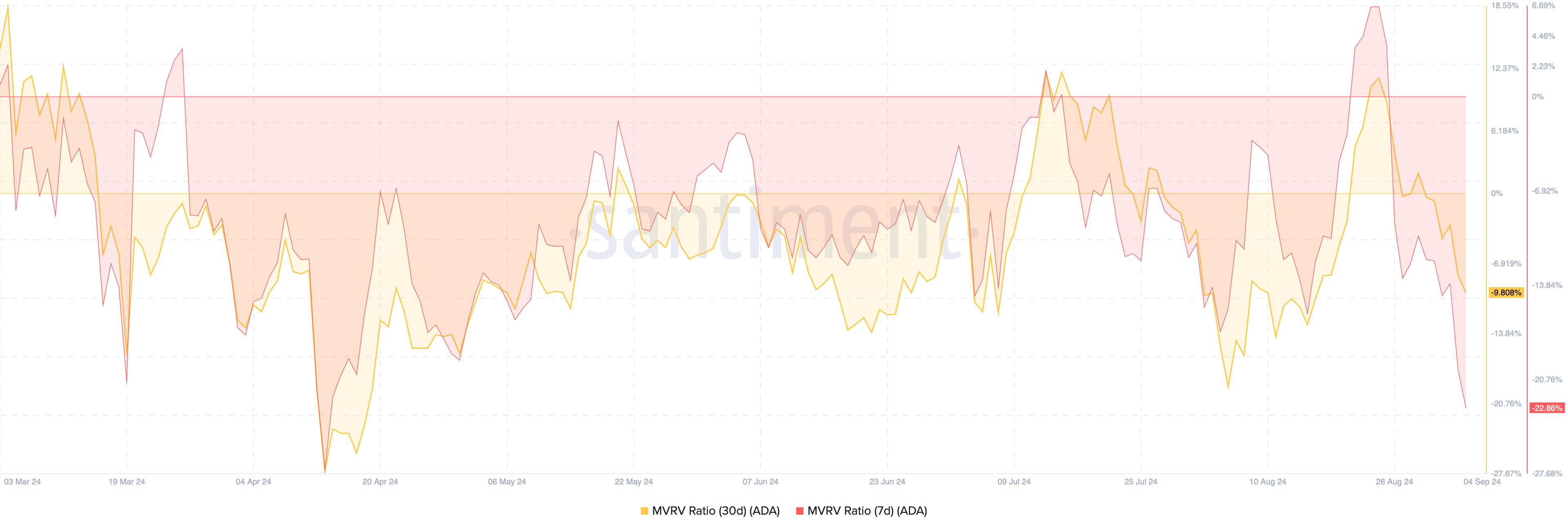 Historiallisesti Cardanon natiivikolikko saavuttaa pohjansa, kun 30 päivän MVRV-suhde on välillä -16 % ja -27 %. Siksi, jos menneisyys toistaa itseään tässä trendissä, niin merkittävä palautus saattaa olla lähellä.