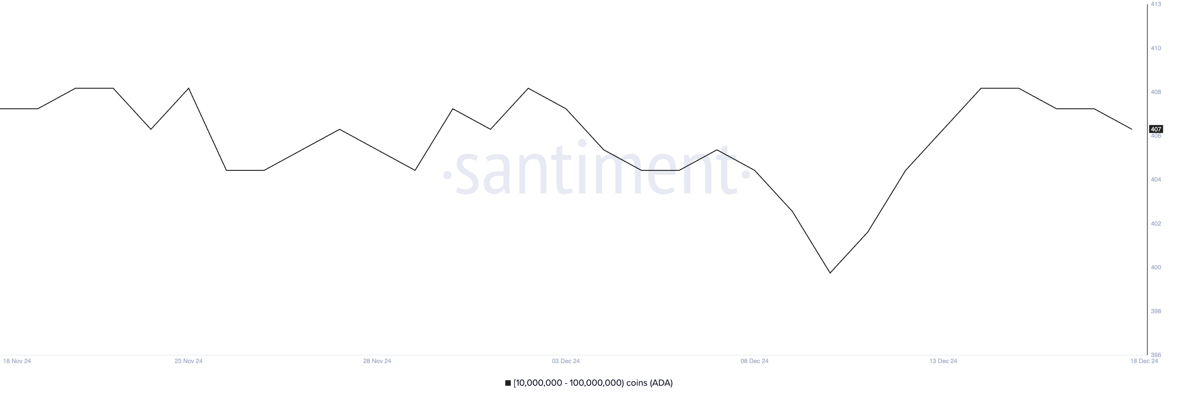 Osoitteiden määrä, jotka pitävät hallussaan 10 miljoonaa – 100 miljoonaa ADA, on laskenut 407:ään, kun se oli viisi päivää sitten 409. Tämä lasku viittaa suurten haltijoiden, eli valaitten, määrän tasaiseen vähenemiseen, mikä seurasi jyrkkää nousua aiemmin joulukuussa.
