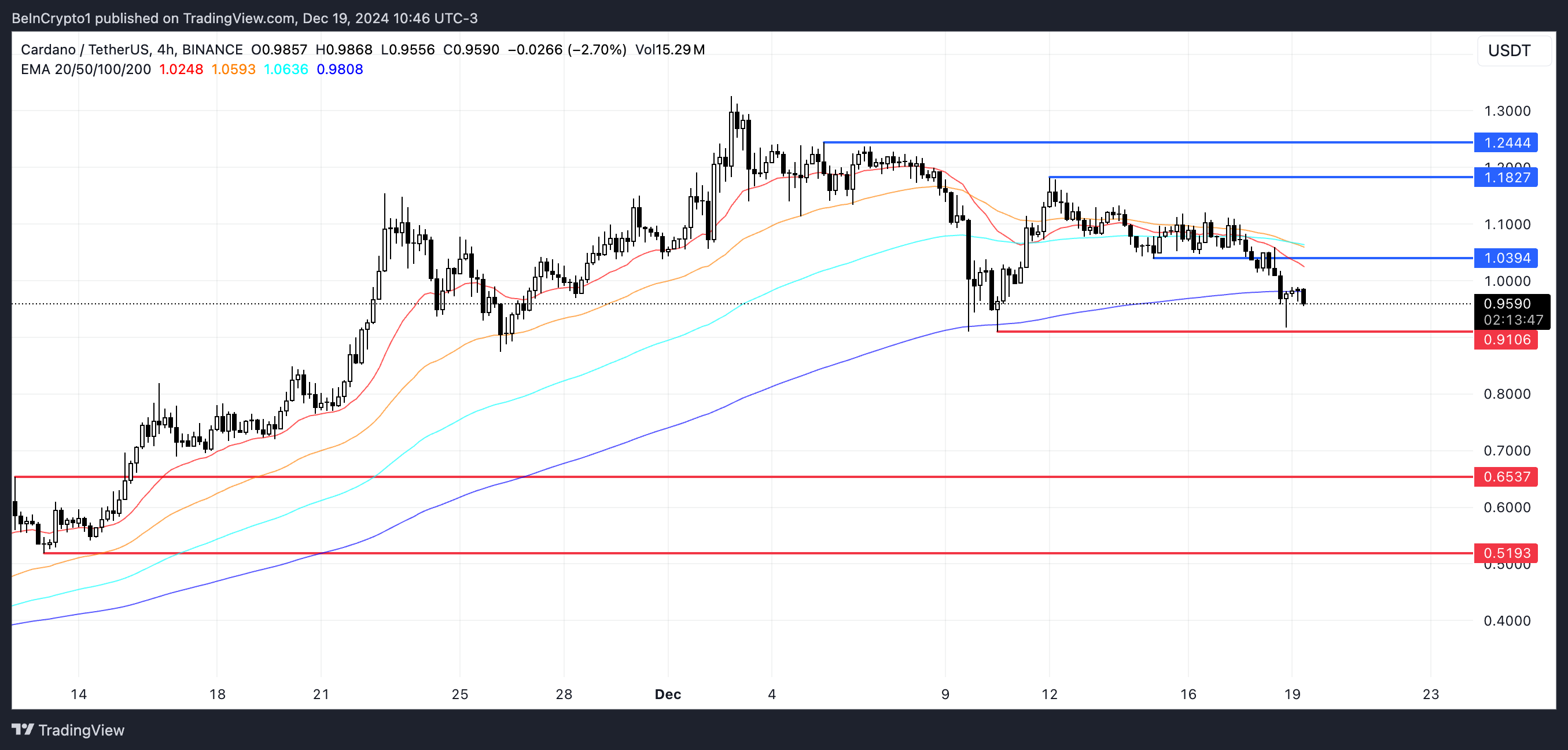 Cardano EMA-linjat osoittavat mahdollisuutta voimakkaampaan korjaukseen, kun lyhyen aikavälin EMA:t ovat laskusuunnassa. Lyhin EMA on lähellä risteämistä pisimmän EMA:n alapuolelle, mikä muodostaisi death crossin, karhumaisen signaalin, joka yleensä viittaa jatkuvaan laskumomenttiin.