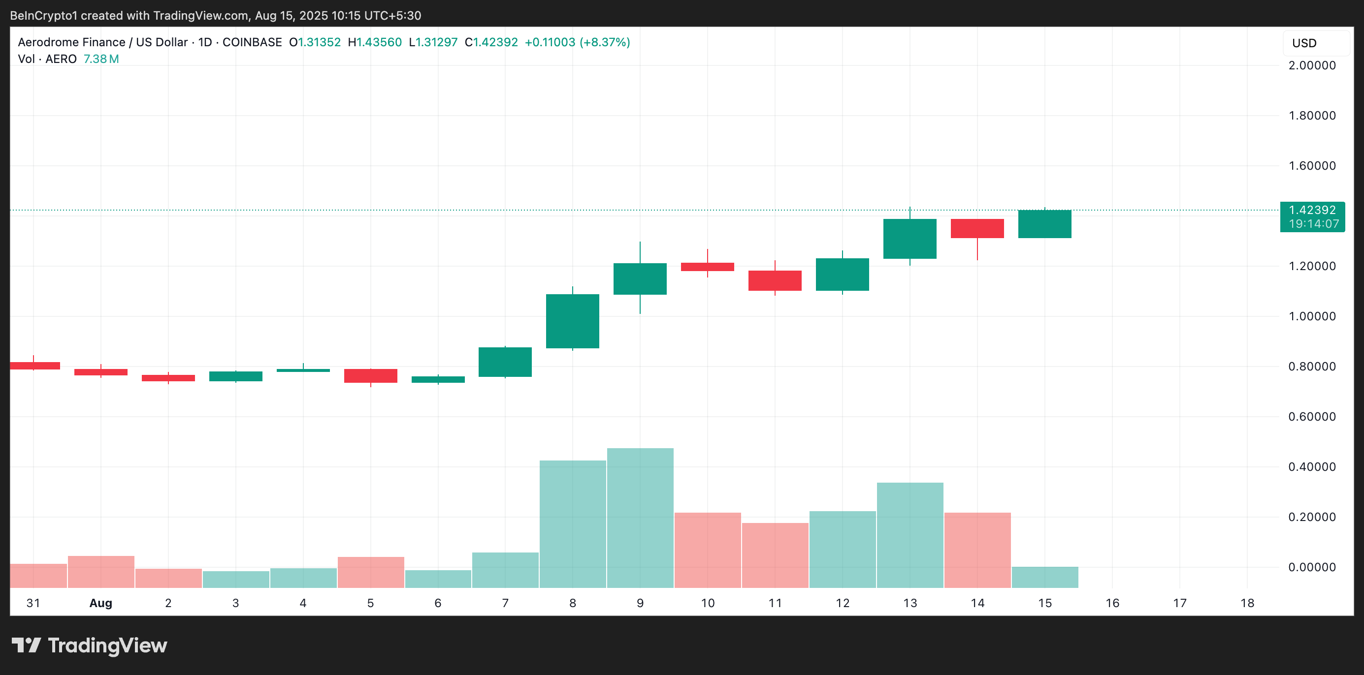 AERO:n 4 % päivittäinen hintaralli on seurannut 23 % notkahdusta sen kaupankäyntivolyymissa, joka on yhteensä 162,41 miljoonaa dollaria tätä kirjoitettaessa. Tämä muodostaa negatiivisen eron, mikä osoittaa, että vain muutama markkinaosapuoli tukee nousua.