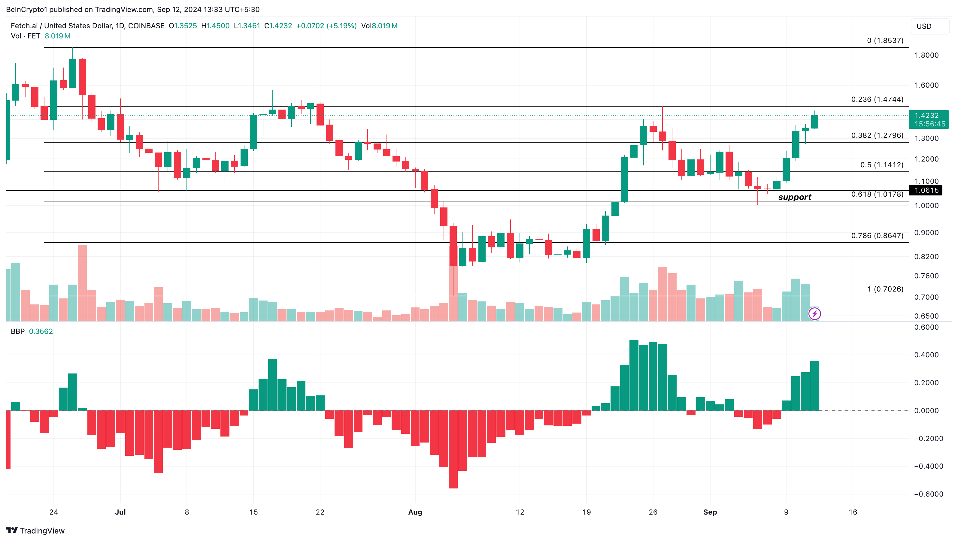 Kehityksen myötä AI-kolikot, mukaan lukien FET, NEAR ja Render (RNDR), ovat rekisteröineet hinnannousuja. Esimerkiksi FET:n hinta oli 1,28 dollaria 11. syyskuuta. Tänään altcoin käy kauppaa 1,42 dollarilla.