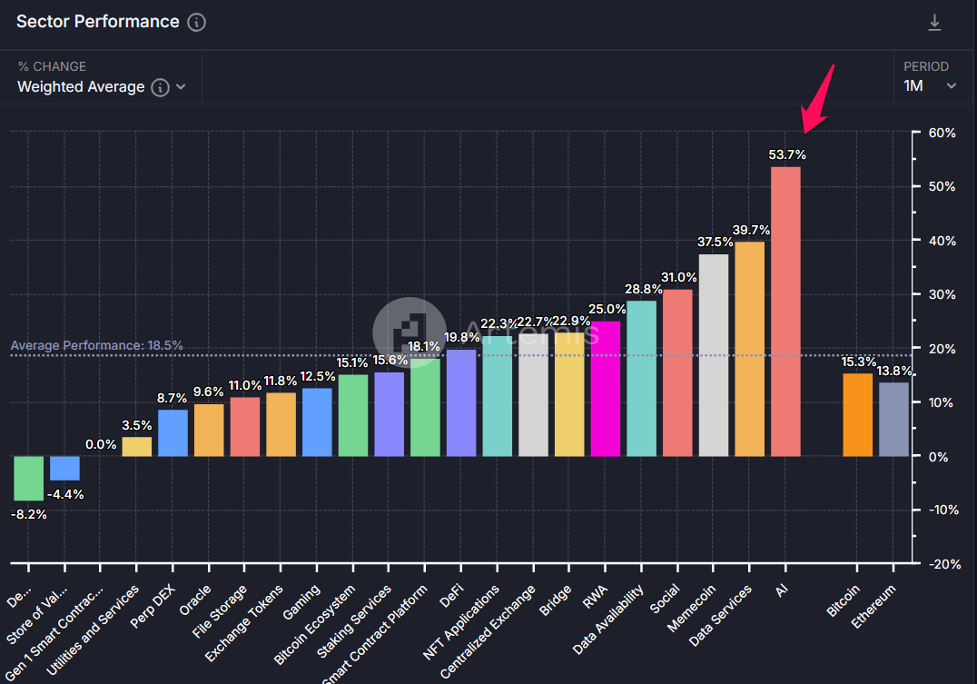 Siitä huolimatta tekoälytokenien kiinnostus jää edelleen jälkeen meemikolikoista ja Solanan meemikolikoista. Kuitenkin lokakuun tiedot Artemisilta osoittavat, että tekoälytokenit ovat saavuttaneet paremman hintasuorituskyvyn viimeisen 30 päivän aikana.