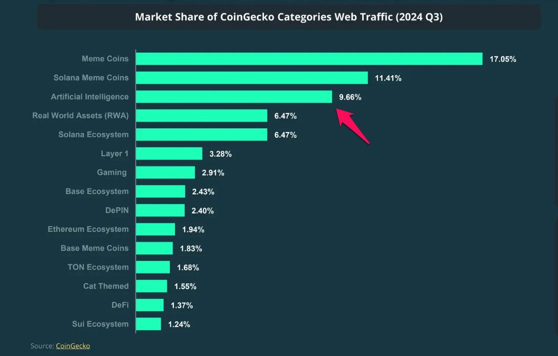 CoinGeckon äskettäisen raportin mukaan tekoälyprojektien osuus alustan liikenteestä on 9,66% kokonaisliikenteestä. Yli 20 miljoonan kuukausittaisen käynnin myötä tämä tarkoittaa noin 2 miljoonaa katselukertaa tekoälyprojekteille kuukaudessa.