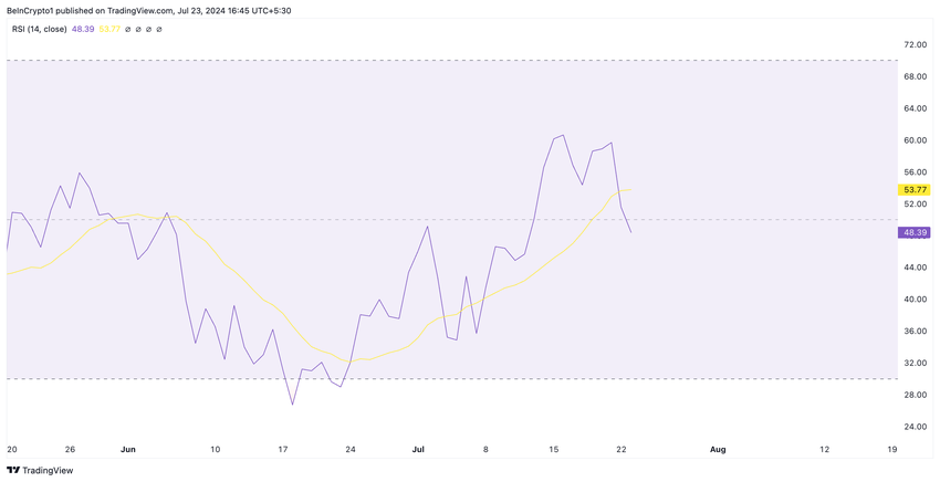 Lisäksi ALGOn suhteellinen voimaindeksi (RSI) on myös laskutrendissä. Lehdistöhetkellä se oli ylittänyt 50 neutraalin viivan ja havaittiin 48.39.