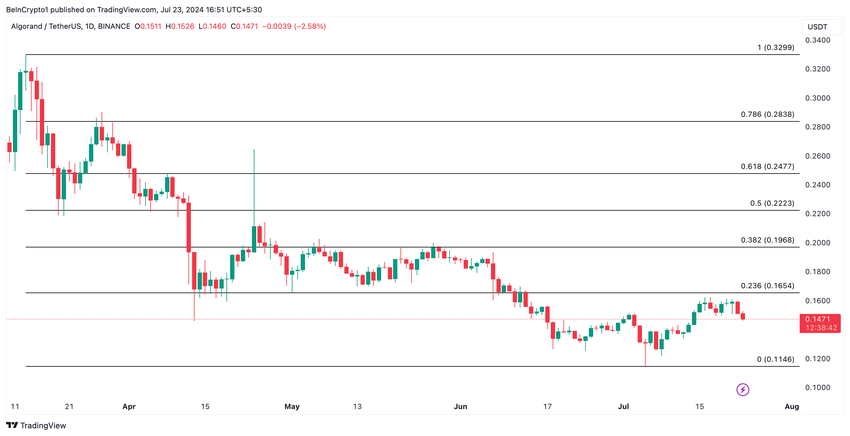 Algorand (ALGO) saavutti 30 päivän korkeimman arvon 0,15 dollarissa 16. heinäkuuta. Altcoinin hinta on kuitenkin sittemmin vakiintunut ja käynyt kauppaa sivuttain kapealla alueella.