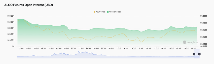Huolimatta ALGO:n sivuttaisista hintaliikkeistä viime päivinä, aktiviteetti sen johdannaismarkkinoilla ei ole hidastunut. Itse asiassa sen futuurien avoin kiinnostus on noussut 7% heinäkuun 18. päivän jälkeen.