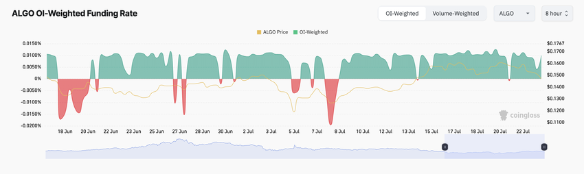 Nämä ALGO-markkinoille tulevat uudet kauppiaat ovat avanneet positioita hintarallin hyväksi. Coinglassin tietojen mukaan tokenin rahoitusaste on pysynyt pääosin positiivisena 9. heinäkuuta lähtien. Tätä kirjoitettaessa se on 0,0099%.