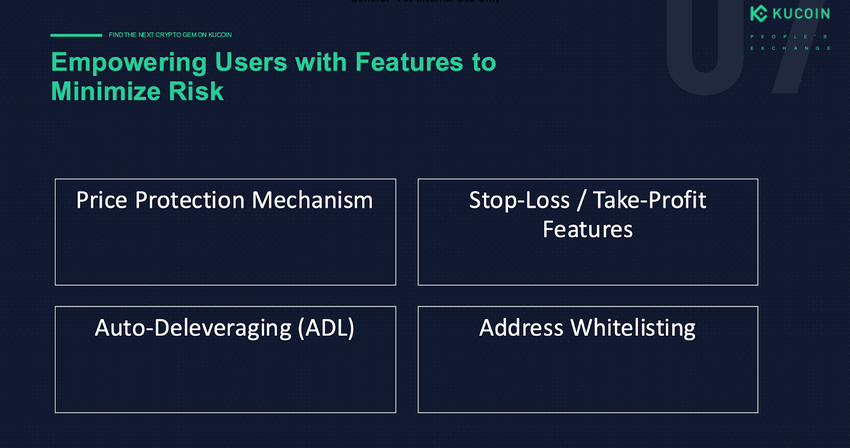 Käyttäjäkoulutuksen lisäksi Alicia korosti KuCoinin keskittymistä turvallisuuteen tarjoamalla riskienhallintatyökaluja, jotka sisältävät hinnansuojauksen, stop-loss/take-profit-toiminnot, automaattisen velkavivun purkamisen (ADL) ja osoitteiden valkoisen listauksen.