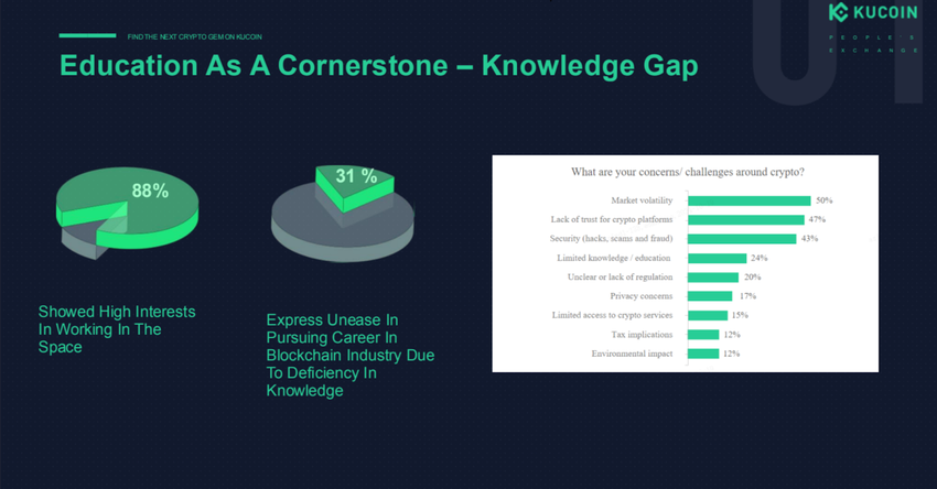 Luottamuspulan voittamiseksi KuCoin lanseerasi koulutusohjelmia, kuten KuCoin Learn & Earn ja KuCoin Campus. Alicia korosti, että vain 45 päivän kuluessa KuCoinin Learn & Earn -ohjelmasta 2,7 miljoonaa käyttäjää suoritti erilaisia kursseja ja sai vastineeksi erilaisia palkintoja. Tämä osoittaa vahvaa käyttäjien kysyntää helposti saatavilla olevalle ja luotettavalle kryptokoulutukselle.