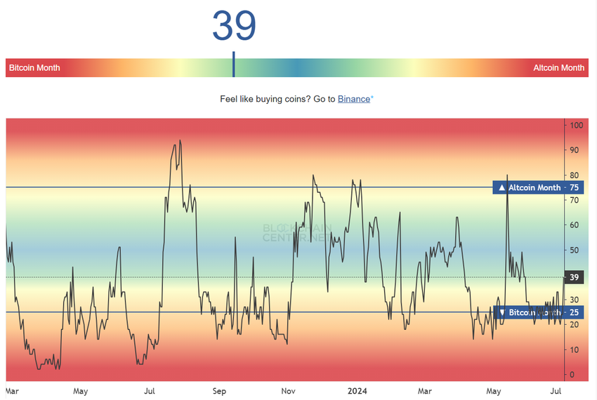 Altcoin-kauden indexin mukaan, markkinoilla on tällä hetkellä Bitcoin-kausi. Yleensä, kun 75% 50 parhaasta altcoinista, stablecoinit pois lukien, toimii paremmin kuin BTC, Altcoin-kautta pidetään aktiivisena.
