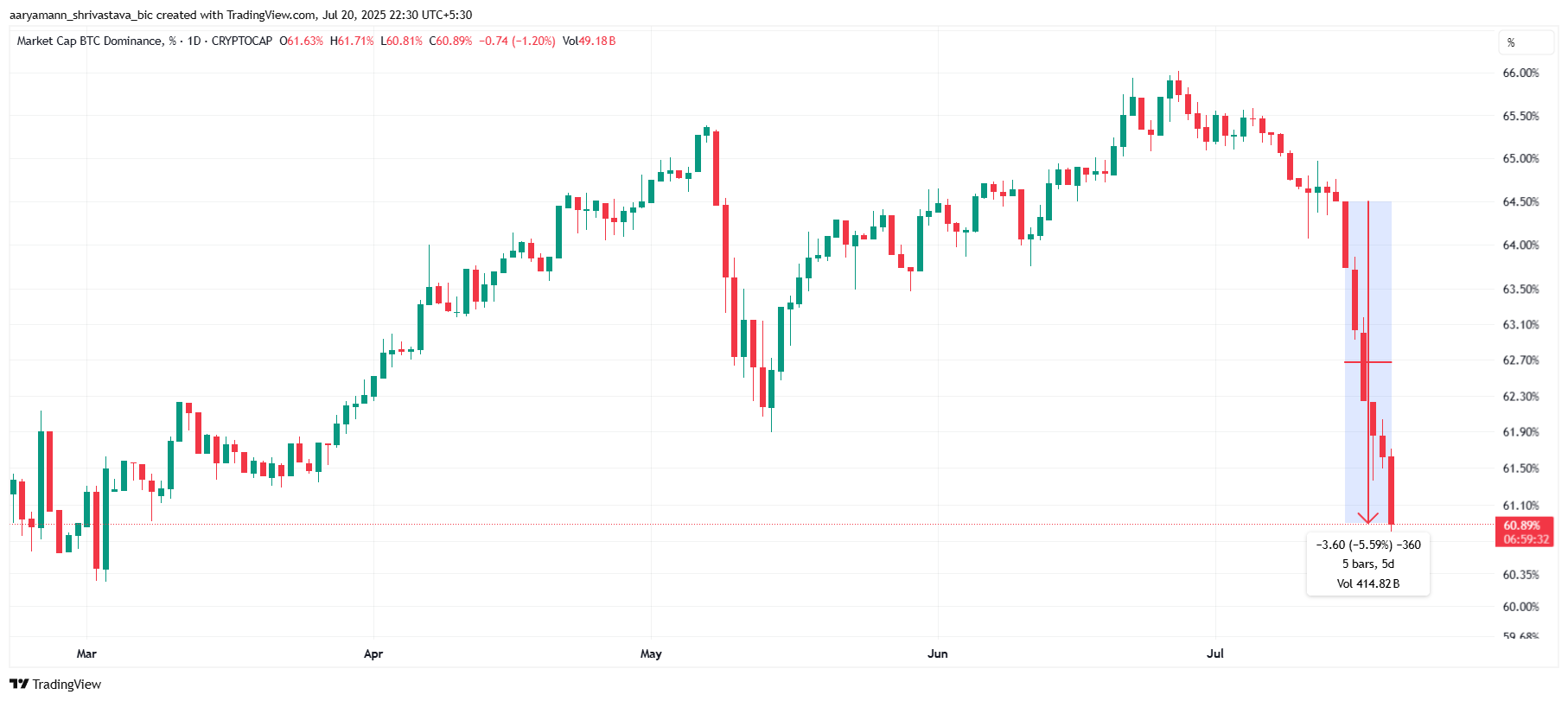 Bitcoinin dominanssi on pudonnut jyrkästi viimeisten viiden päivän aikana, laskien 5,6 %:sta 64,5 %:sta 60,9 %:iin. Tämä lasku merkitsee alhaisinta pistettä neljään ja puoleen kuukauteen ja heijastaa markkinoiden kasvavaa kiinnostusta altcoineihin.