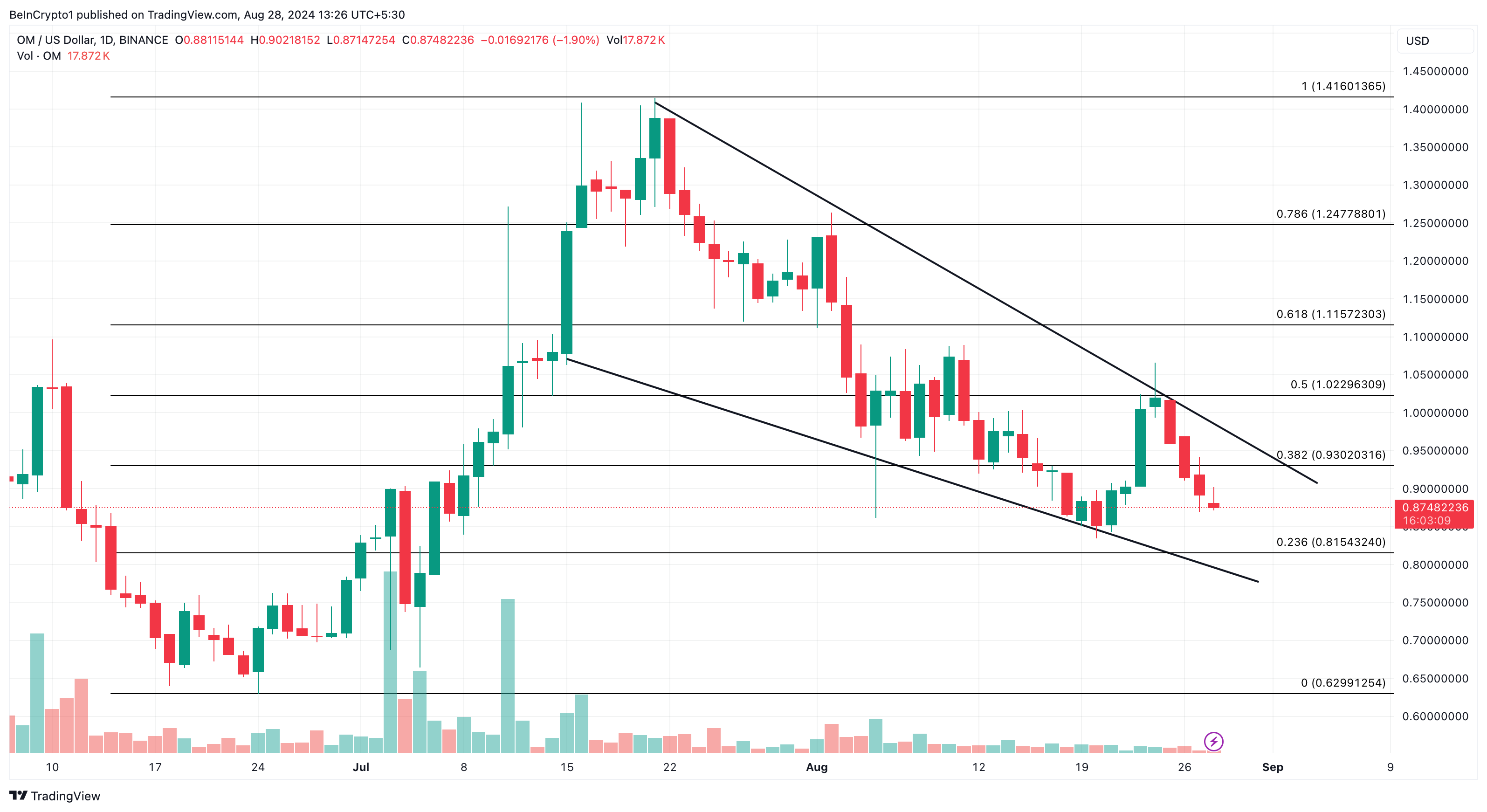 Jos OM ylittää 1,15 dollarin vastustason, sen hinta saattaa ylittää 1,42 dollaria syyskuussa, tehden siitä yhden altcoineista, joka saavuttaa uuden kaikkien aikojen korkeimman hinnan (ATH). Kuitenkin härkämäinen skenaario voitaisiin kumota, jos token putoaa jälleen laskevan kiilan alimpaan kohtaan. Jos näin käy, hinta saattaa romahtaa 0,62 dollariin.