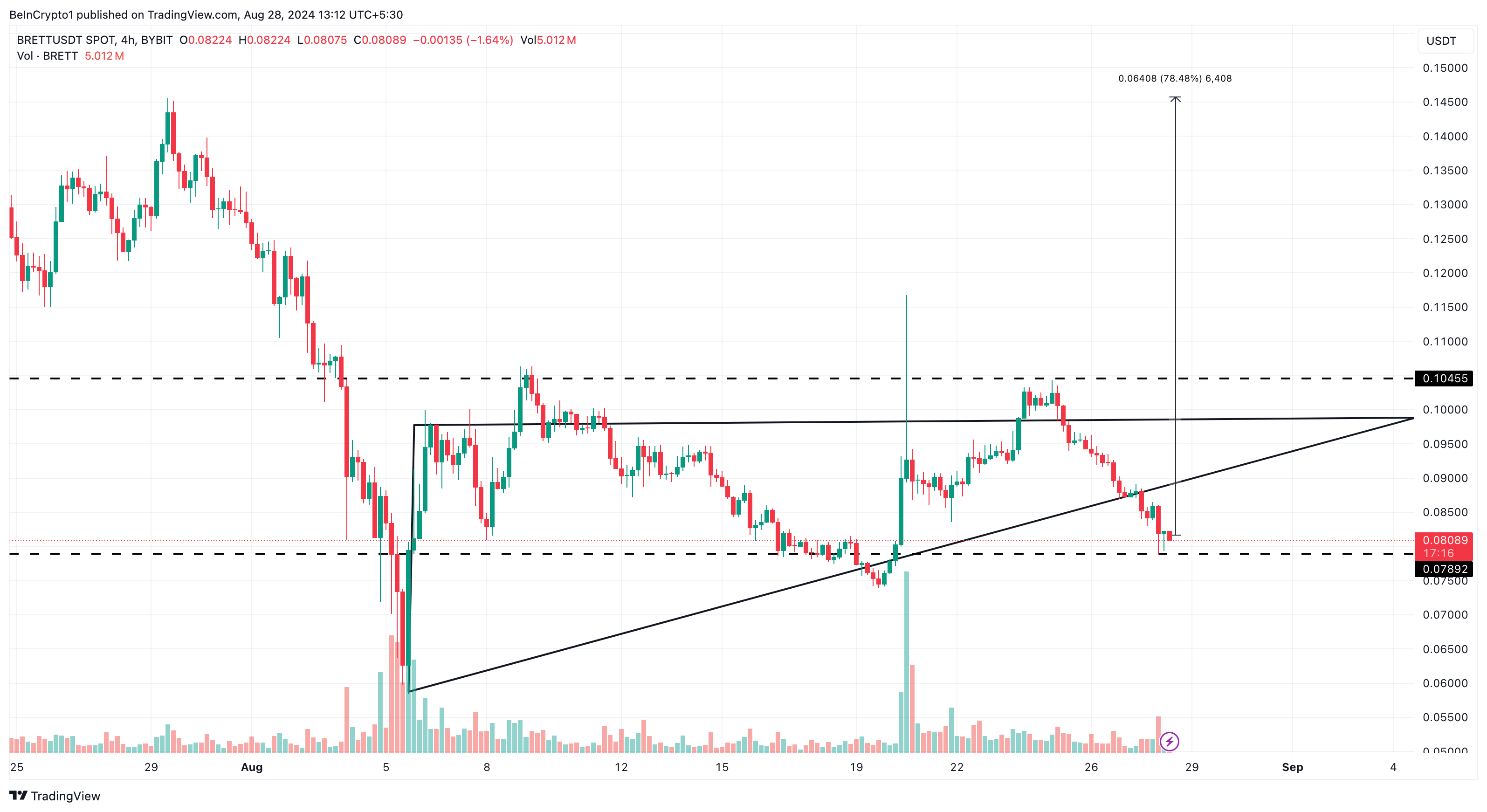 Kun hinnat vaihtelevat näiden korkeiden ja matalien välillä, kryptovaluutat kohtaavat usein vastustusta, kuten BRETT teki pudotessaan 0,10 dollarista 0,081 dollariin. Tämä käännös saattaa kuitenkin olla väliaikainen, mikä viittaa siihen, että merkittävä hintaralli voi olla tulossa, mahdollisesti työntäen tokenin kohti 0,20 dollaria.
