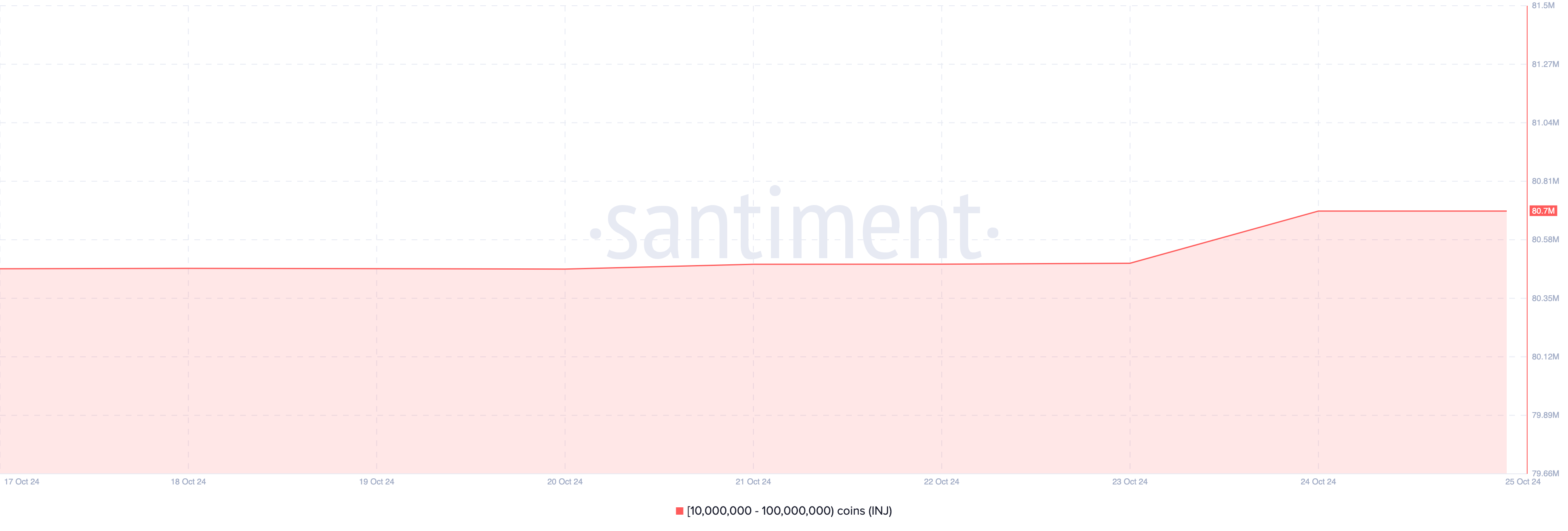 Myös Injective-token kuuluu tällä viikolla valaiden ostamiin altcoineihin. Santimentin mukaan osoitteiden, jotka pitävät hallussaan 10 miljoonasta 100 miljoonaan INJ:hin, saldo nousi 80,49 miljoonasta 80,70 miljoonaan.
